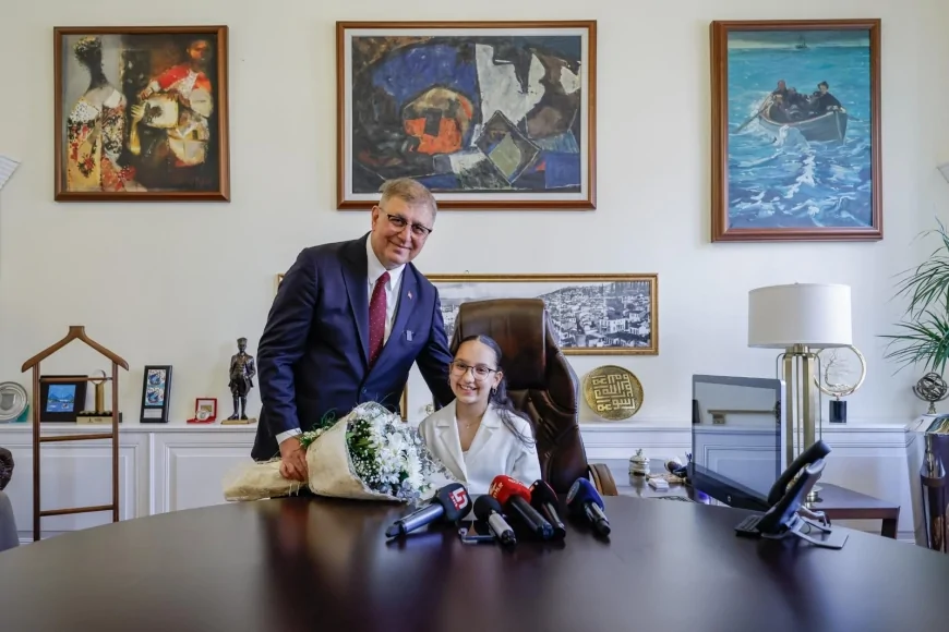 İzmir Büyükşehir Belediye Başkanı Cemil Tugay, 23 Nisan Ulusal Egemenlik ve Çocuk Bayramı dolayısıyla başkanlık koltuğunu Atakent Erdoğan Kibarer Ortaokulu 6. sınıf öğrencisi ve İzmir Çocuk Meclisi Sözcüsü Derin Taş’a bıraktı. 12 yaşındaki Taş, makamda ailesiyle birlikte ağırlandı. Başkan Tugay, ‘Senin gibi güzel çocuklarımız bu tür görevlerde yer aldıkça, diğer çocuklara da ilham olacaklar’ diyerek Taş’a destek verdi.