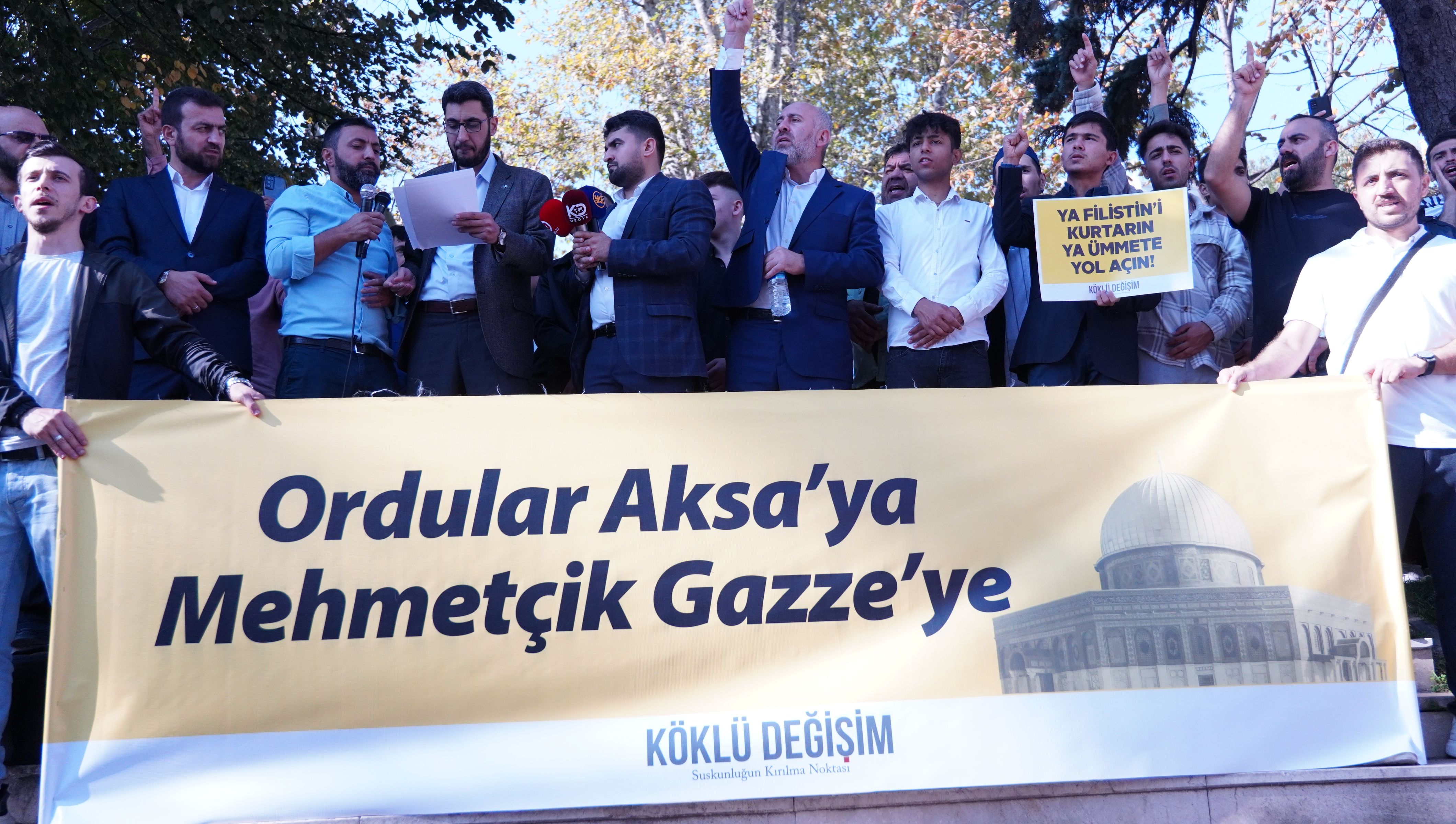 Yürüyüşün tamamlanmasının ardından Saraçhane Parkı’nda önce Köklü Değişim Gençlik Kolları Başkanı Muhammed Budak bir konuşma yaptı. Konuşmasında Müslüman gençler olarak asla pes etmeyen, tüm zorluklara sabreden, davasından vazgeçmeyen Muhammed Sallallahu Aleyhi ve Sellem’in ümmeti olduklarını söyledi. Budak Müslüman gençler adına Türkiye yöneticilerine seslenerek şöyle dedi: _“Tüm samimiyetimizle şer’i ve tarihi bir sorumluluk olarak buradan sesleniyoruz! Ey Müslümanların yöneticileri! Ya Filistin’i kurtarın Ya Filistin’e yol açın! İşte, biz buradayız! Hazırız! Biz Filistin’deki Müslüman kardeşlerimizle birlikte olmak istiyoruz! Ellerimizi onların elleriyle birleştirmek istiyoruz. Onlara yardım etmek istiyoruz. “