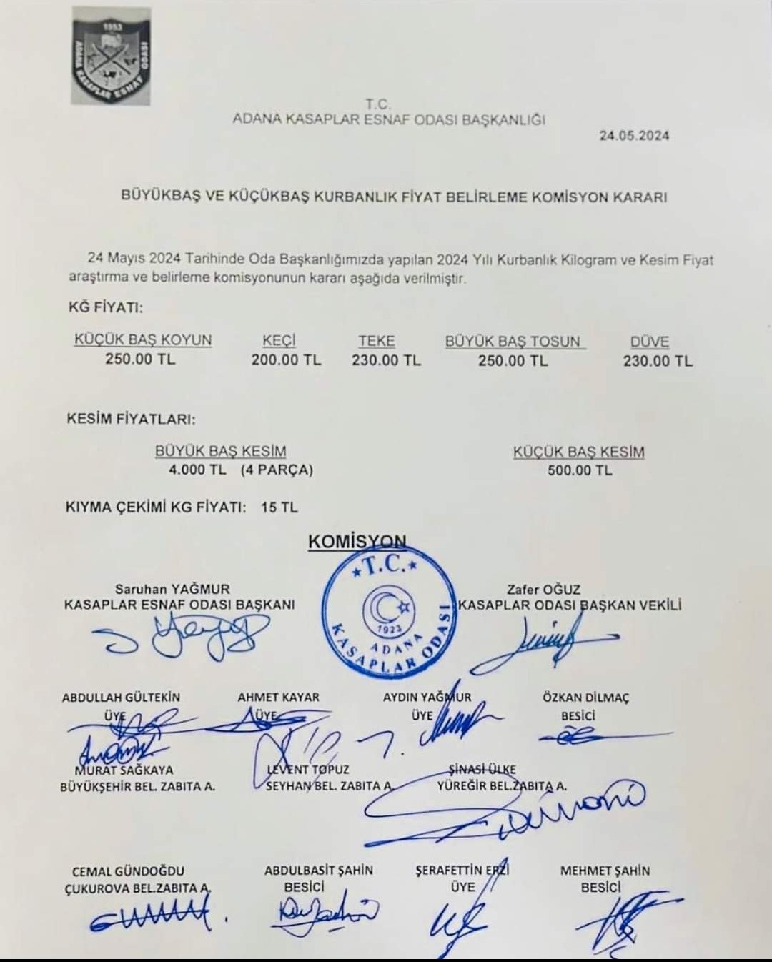 Adana Kasaplar Odası Kurban Fiyatlarını Açıkladı