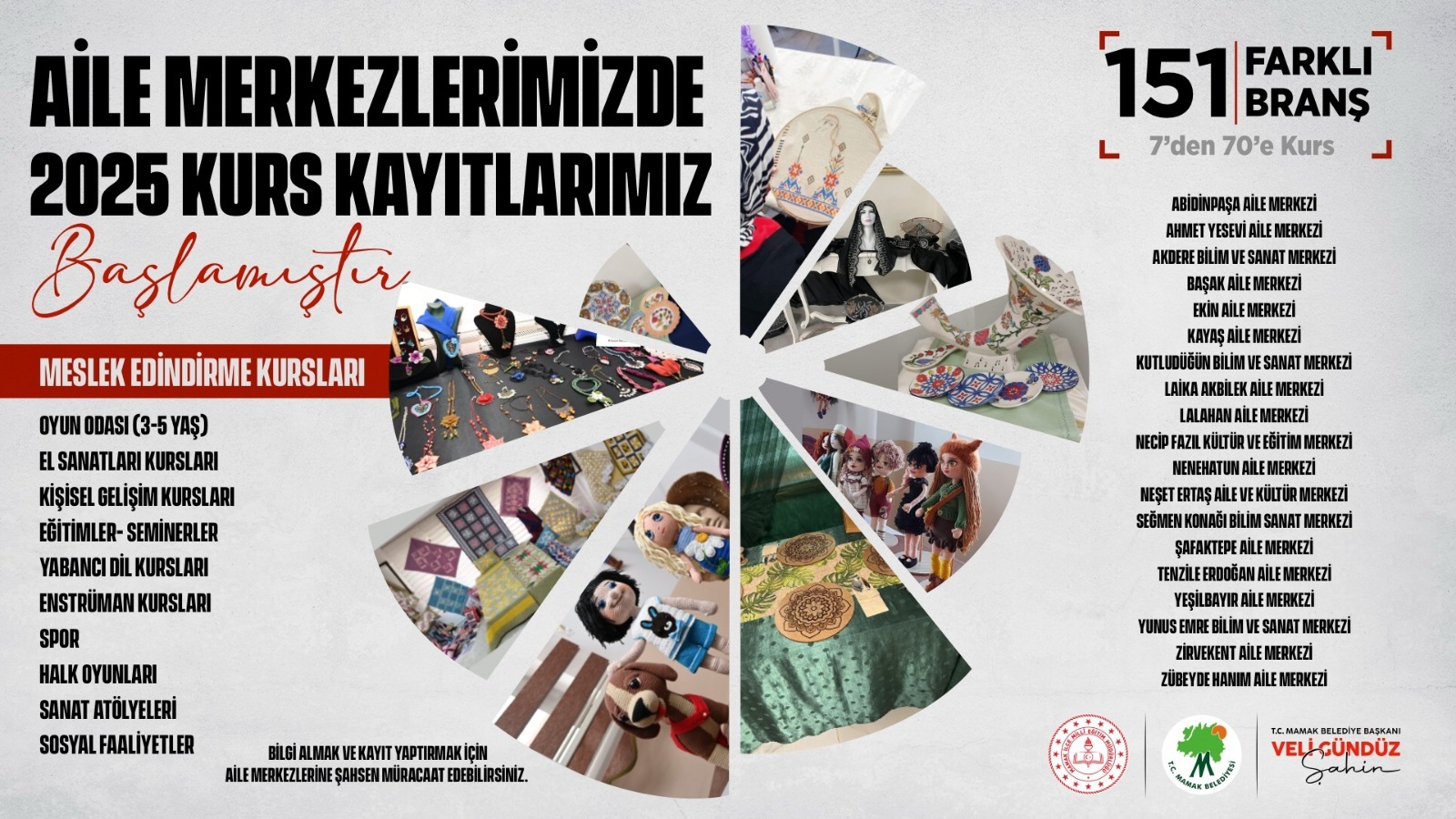 Mamak Belediyesi Aile Merkezlerinde 2024-2025 eğitim yılı kış dönemi kurs kayıtları başladı. Geleneksel el işlerine dair zanaatlardan sanat kurslarına, güzel sanatlardan kişisel gelişim kurslarına, meslek edindirme ve istihdama yönelik 19 merkezde, 29 temel branşta eğitimler verilecek.