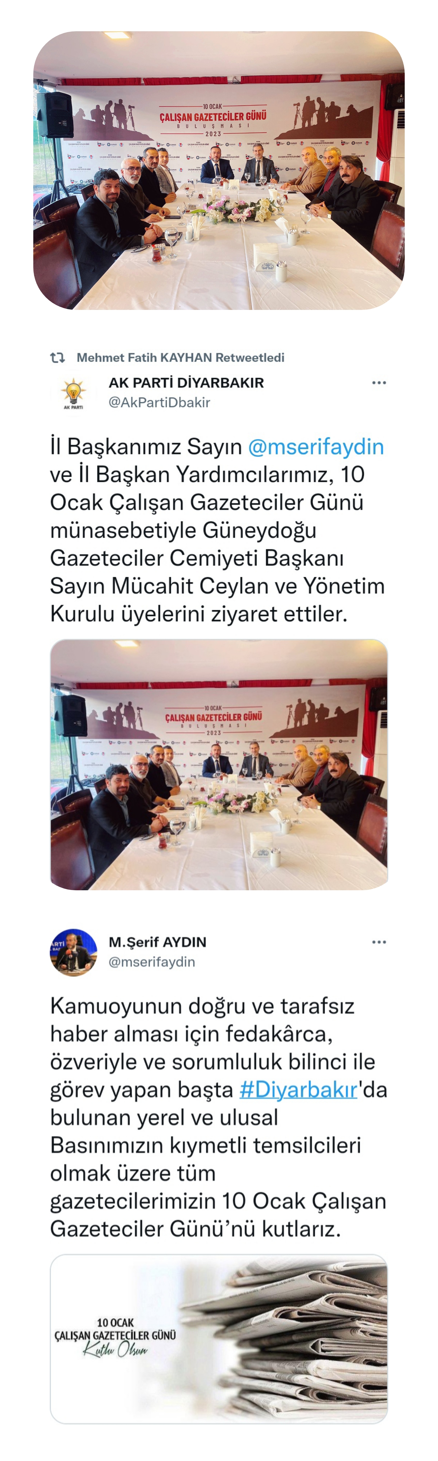 İl Başkanı M. Şerif Aydın resmi sosyal medya hesabından yaptığı açıklamada: Kamuoyunun doğru ve tarafsız haber alması için fedakârca, özveriyle ve sorumluluk bilinci ile görev yapan başta #Diyarbakır'da bulunan yerel ve ulusal Basınımızın kıymetli temsilcileri olmak üzere tüm gazetecilerimizin 10 Ocak Çalışan Gazeteciler Günü’nü kutlarız.