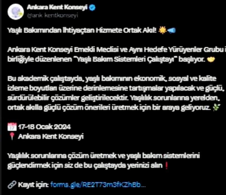 Çalıştaya katılmak isteyenler için başvuru linki Ankara Kent Konseyi'nin sosyal medya hesapları üzerinden paylaşıldı. Katılımcıların, yaşlılık sorunlarına çözüm üretmek ve bakım sistemlerinin geliştirilmesine katkı sağlamak amacıyla bu etkinlikte yer alması çağrısında bulunuldu.