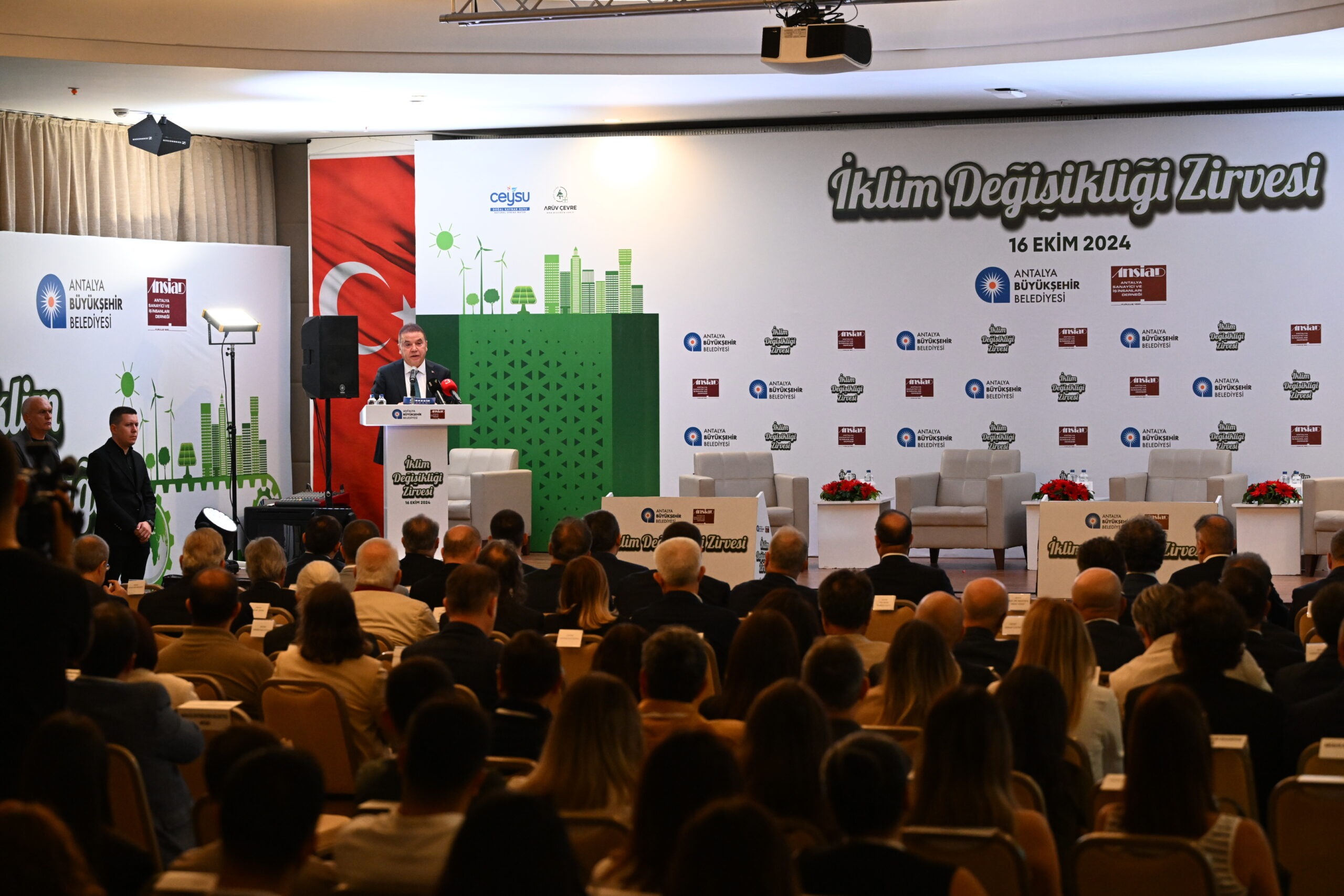 Antalya Büyükşehir Belediyesi, iklim değişikliği ile mücadele ve uyum konusundaki farkındalık çalışmaları kapsamında Antalya Sanayici ve İş İnsanları Derneği (ANSİAD) işbirliğinde “İklim Değişikliği Zirvesi” gerçekleştirdi. İklim Değişikliği Zirvesi’ne Antalya Valisi Hulusi Şahin, Antalya Büyükşehir Belediye Başkanı Muhittin Böcek, ANSİAD Başkanı Ercan Özbek, Sivil Toplum Kuruluşları, akademisyenler ve çok sayıda davetli katıldı. Antalya Büyükşehir Belediye Başkanı Muhittin Böcek, iklim krizinden en çok etkilenecek kentlerden birinin Antalya olduğuna dikkat çekti. Antalya’nın iklim değişikliğinden göreceği zararların ulusal ve uluslararası boyutlarda olabileceğini ifade eden Muhittin Böcek, “Antalya’mızın sahip olduğu zengin çevre değerlerini korumak ve gelecek nesillere taşımak için nötr karbon hedefimizle ilerliyoruz. İklim değişikliği ile mücadele ve uyum kapsamında tarım, turizm, peyzaj, ulaşım, altyapı, kültür ve sanat gibi birçok alanda çevre odaklı, bilime ve tekniğe dayalı, ortak akılla çalışmalarımızı sürdürüyoruz” diye konuştu.