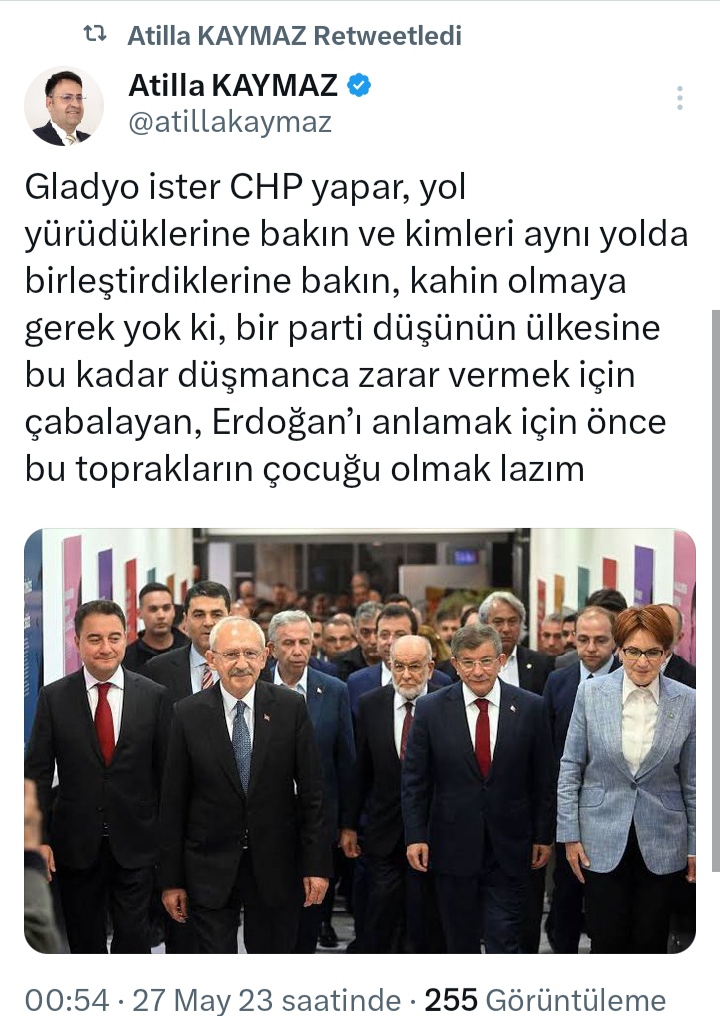 "Gladyo ister CHP yapar, yol yürüdüklerine bakın ve kimleri aynı yolda birleştirdiklerine bakın, kahin olmaya gerek yok ki, bir parti düşünün ülkesine bu kadar düşmanca zarar vermek için çabalayan, Erdoğan’ı anlamak için önce bu toprakların çocuğu olmak lazım " dedi.