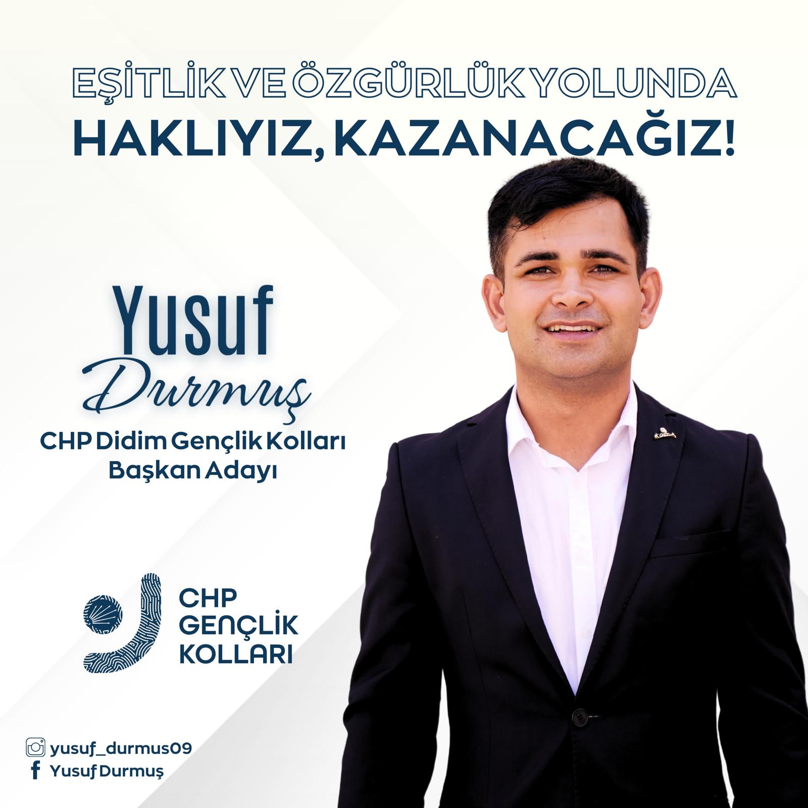 CHP Didim Gençlik Kolları Başkan Adayı Yusuf Durmuş, seçim kampanyasında eşitlik ve özgürlük mesajlarını vurguluyor. Gençlik kolları başkanlığı için adaylığını açıklayan Durmuş, “Eşitlik ve özgürlük yolunda haklıyız, kazanacağız!” sloganıyla yola çıktı.