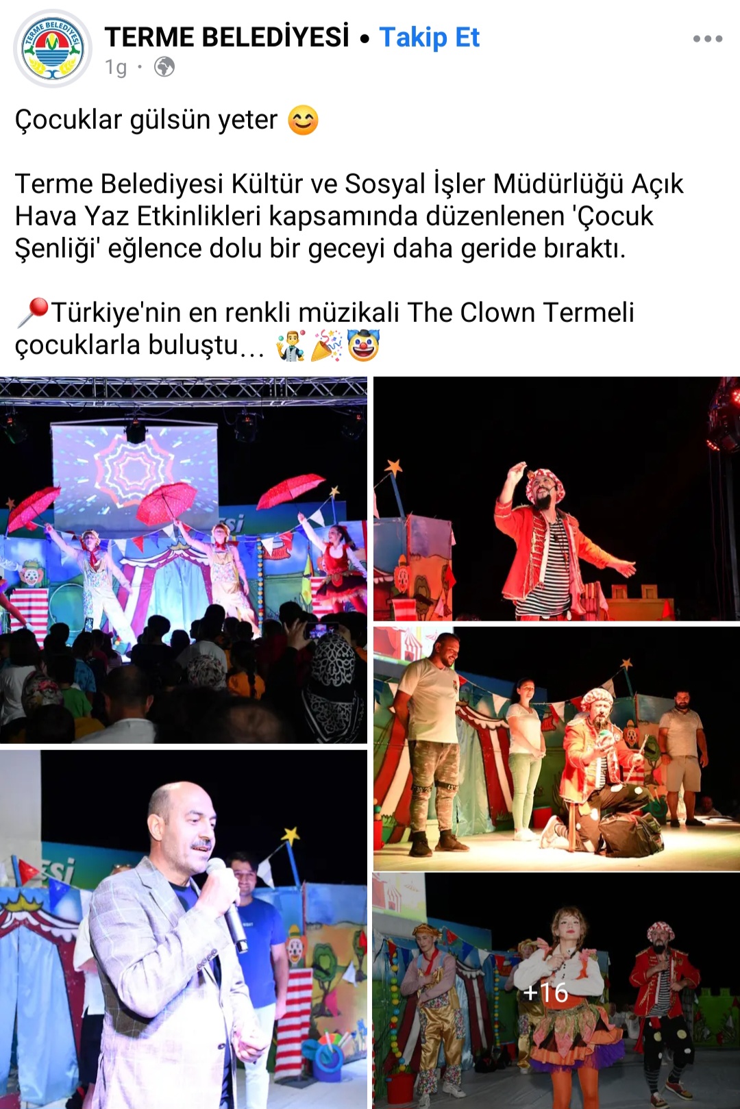 Terme Belediyesi Kültür ve Sosyal İşler Müdürlüğü Açık Hava Yaz Etkinlikleri kapsamında düzenlenen 'Çocuk Şenliği' eğlence dolu bir geceyi daha geride bıraktı. Türkiye'nin en renkli müzikali The Clown Termeli çocuklarla buluştu…