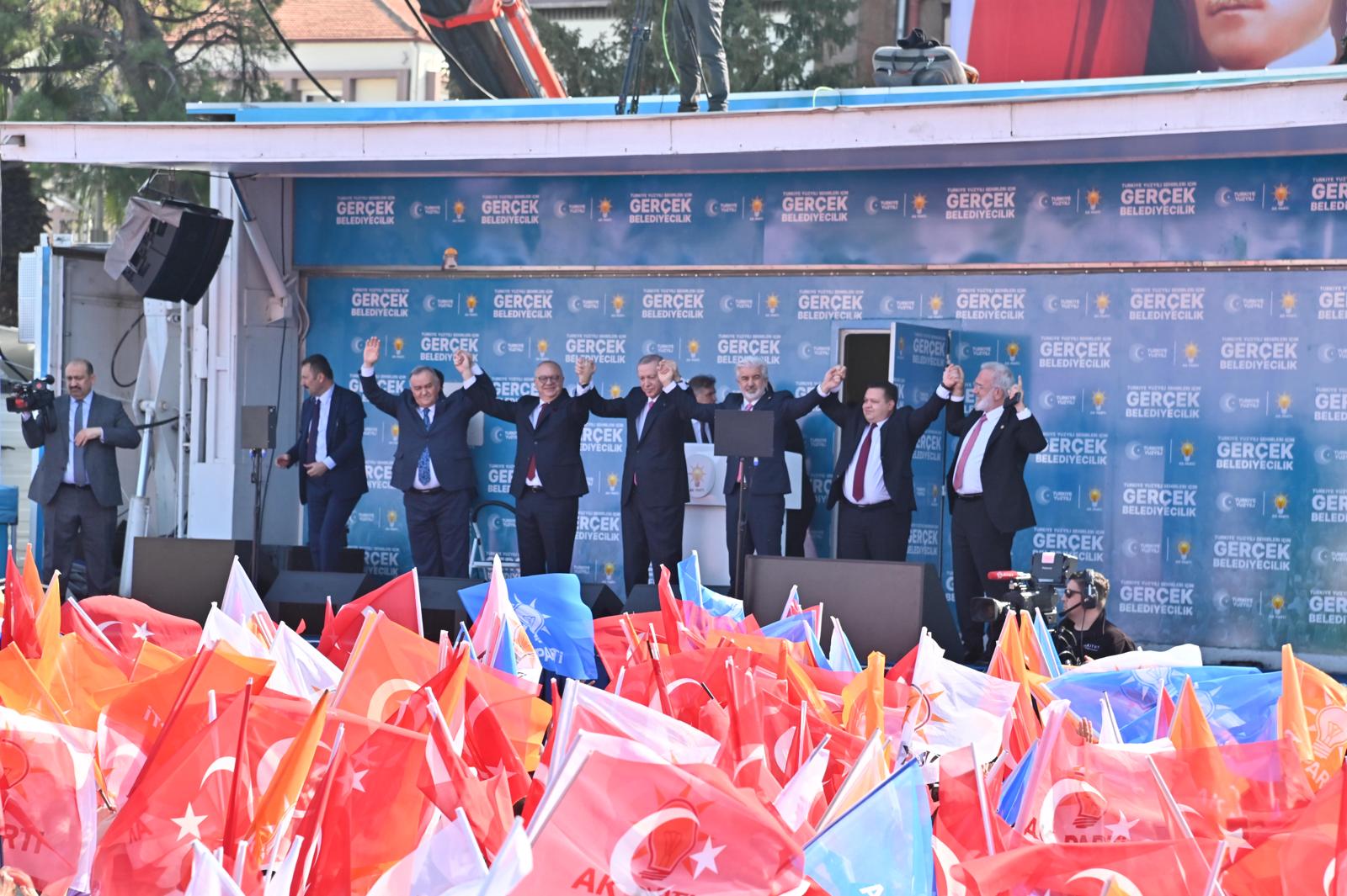 Kula’mızla, Selendi’mizle, Soma, Kırkağaç, Sarıgöl, Gölmarmara, Ahmetli, Alaşehir, Turgutlu, Salihli, Saruhanlı, Gördes ve Akhisar’ımızla güzel Manisa’mızı değiştirdik ve geliştirdik. Çünkü bizler, önce ülkem ve milletim diyen Türkmen Beyimiz Sayın Devlet Bahçeli’nin ve ülkemizi daima ileri götürmek için çalışan Cumhurbaşkanımız Sayın Recep Tayyip Erdoğan’ın temsilcileriyiz. Bizler Türkiye Cumhuriyetinin kurucusu ebedi önderimiz Mustafa Kemal Atatürk’ün izinde, özünde vatan sevgisi ve Türk milletine mensubiyet şuuru bulunan Cumhur İttifakı’nın neferleri olarak, vatanımızı ve şehrimizi geleceğe güvenle taşıyoruz. Sözlerimi noktalamadan önce Cumhurbaşkanımız Sayın Recep Tayyip Erdoğan’a sizler adına bir kez daha Manisa’mıza hoş geldiniz diyorum. Çok şükür ki Manisa, her zaman başaracak olanla, vatan, millet ve bayrak sevdalısı olanlarla yol yürümüştür. Allah’ın izniyle 31 Mart’ta da Manisa; Büyükşehirle birlikte 17 ilçesiyle Cumhur İttifakı diyecek ve Cumhurbaşkanımız Sayın Recep Tayyip Erdoğan’a; Bilge Liderimiz Sayın Devlet Bahçeli’ye Cumhur İttifakı’nın zaferinin müjdesini verecektir. Bu duygularla 31 Mart seçimlerinin Manisa’mız ve ülkemiz için hayırlara vesile olmasını temenni ediyorum. Çıkmış olduğumuz bu kutlu yolda Rabbim hepimizin yar ve yardımcısı olsun. Bir kez daha alanı dolduran siz değerli hemşerilerime ayrı ayrı teşekkür ediyorum. Sağ olun, var olun, Allah’a emanet olun” diyerek konuşmasını tamamladı.