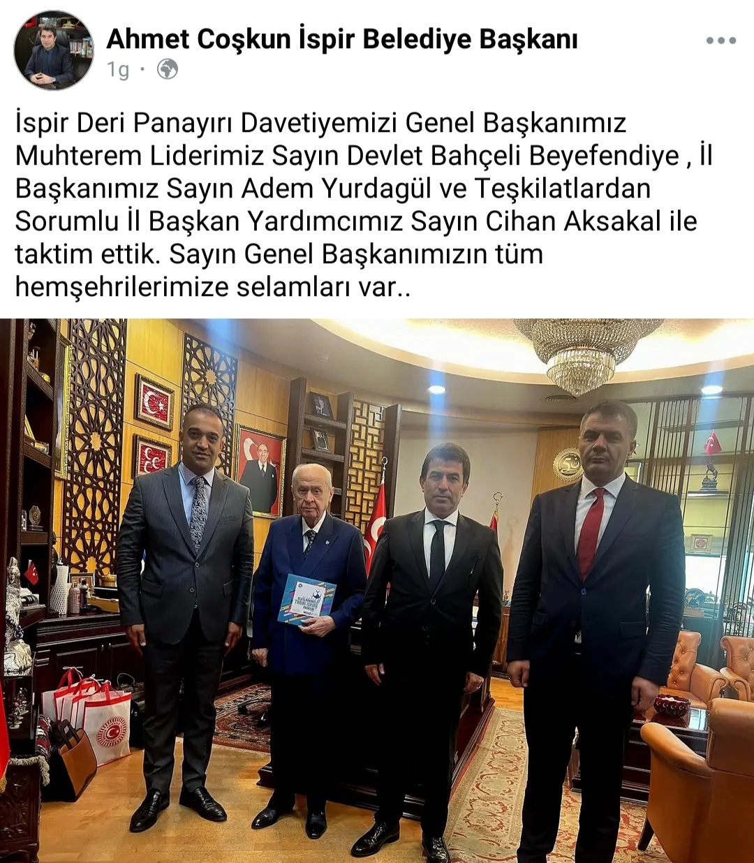 İspir Deri Panayırı Davetiyemizi Genel Başkanımız Muhterem Liderimiz Sayın Devlet Bahçeli Beyefendiye , İl Başkanımız Sayın Adem Yurdagül ve Teşkilatlardan Sorumlu İl Başkan Yardımcımız Sayın Cihan Aksakal ile taktim ettik. Sayın Genel Başkanımızın tüm hemşehrilerimize selamları var..