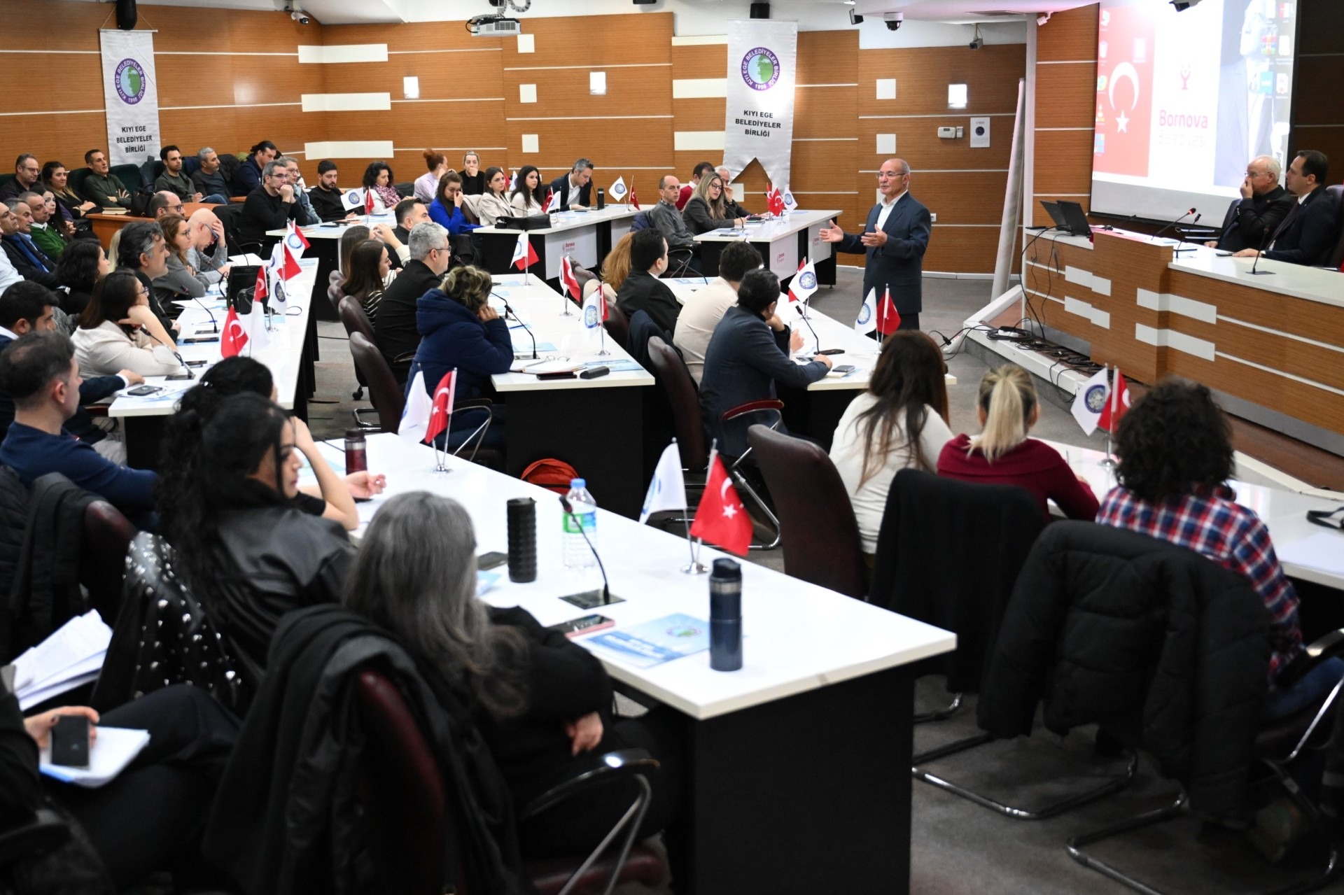 Bornova Belediyesi Meclis Salonu’nda düzenlenen toplantıya Kıyı Ege Belediyeler Birliği Genel Sekreteri Hurşit Akdemir ve Sayıştay Eski 4. Daire Başkanı Abdurrahman Acar konuşmacı olarak katıldı.