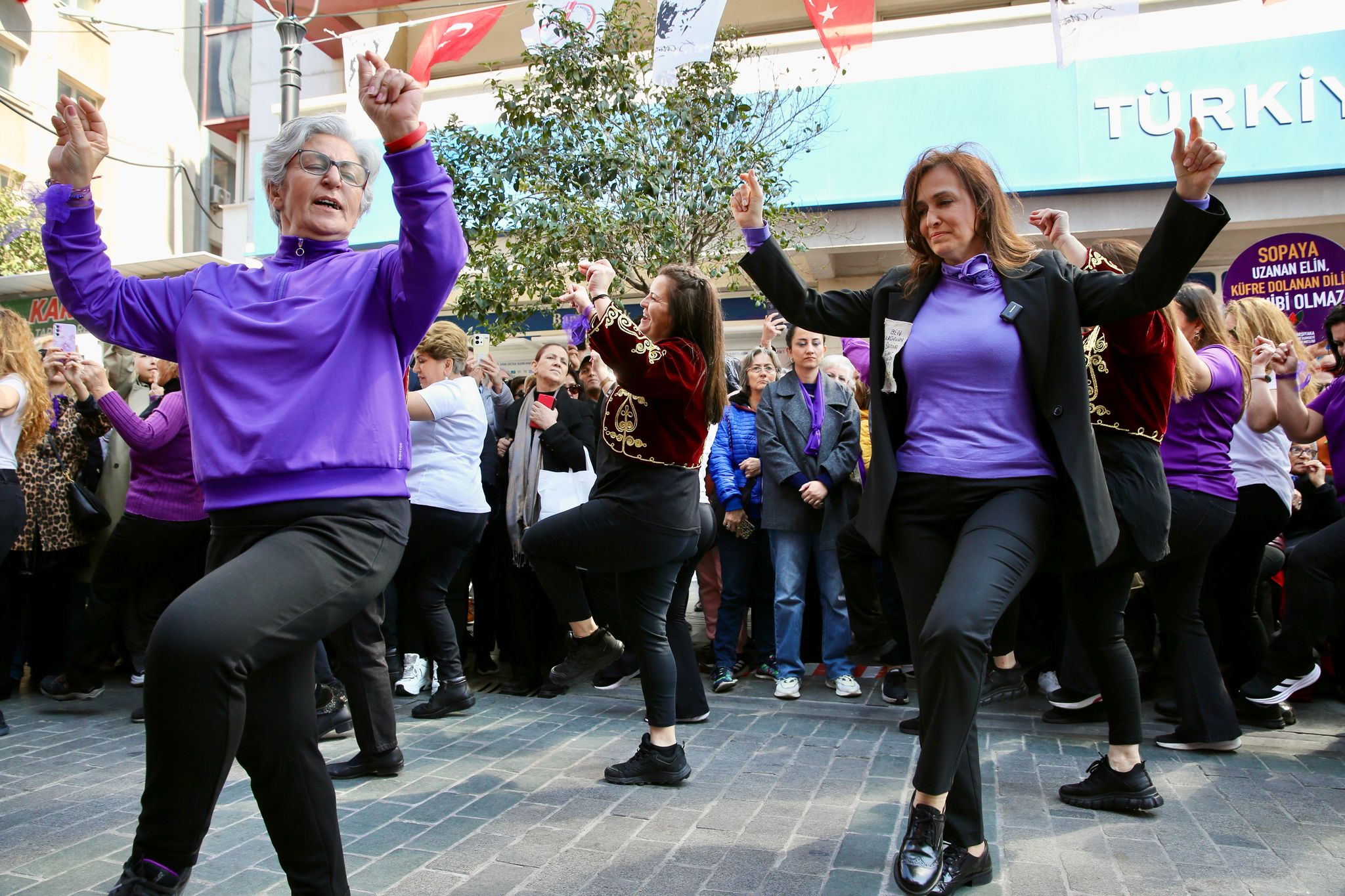 Karşıyaka Belediye Başkanı Yıldız Ünsal, Dünya Emekçi Kadınlar Günü dolayısıyla kadınlarla omuz omuza harmandalı oynadı.