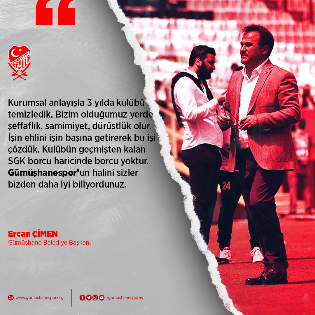 Gümüşhanespor Kulübü başkanı olarak, Sayın Ercan Çimen’in şehrimizin takımı Gümüşhanespor’un ayakta kalması ve yaşaması için mücadelesinde şahitiz ve gelişimine olan katkılarına minnettarız. Gümüşhanesporumuzun zorlu süreçlerden geçerken ve büyük borçlarla mücadele ederken başkanımızın her an yanımızda olması ve bu mücadelede bizlere gerek maddi gerek manevi yol gösterici olması işlerimizi daha da kolaylaştırmıştır.