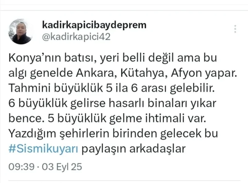 Kapıcı’nın bu son çıkışı, özellikle İç Anadolu’da yaşayan vatandaşlar arasında tedirginlik yarattı. Daha önce Marmara, Ege ve Akdeniz bölgelerinde yaşanan depremlerden sonra gündeme gelen bu tür uyarılar, kamuoyunda geniş yankı buluyor.