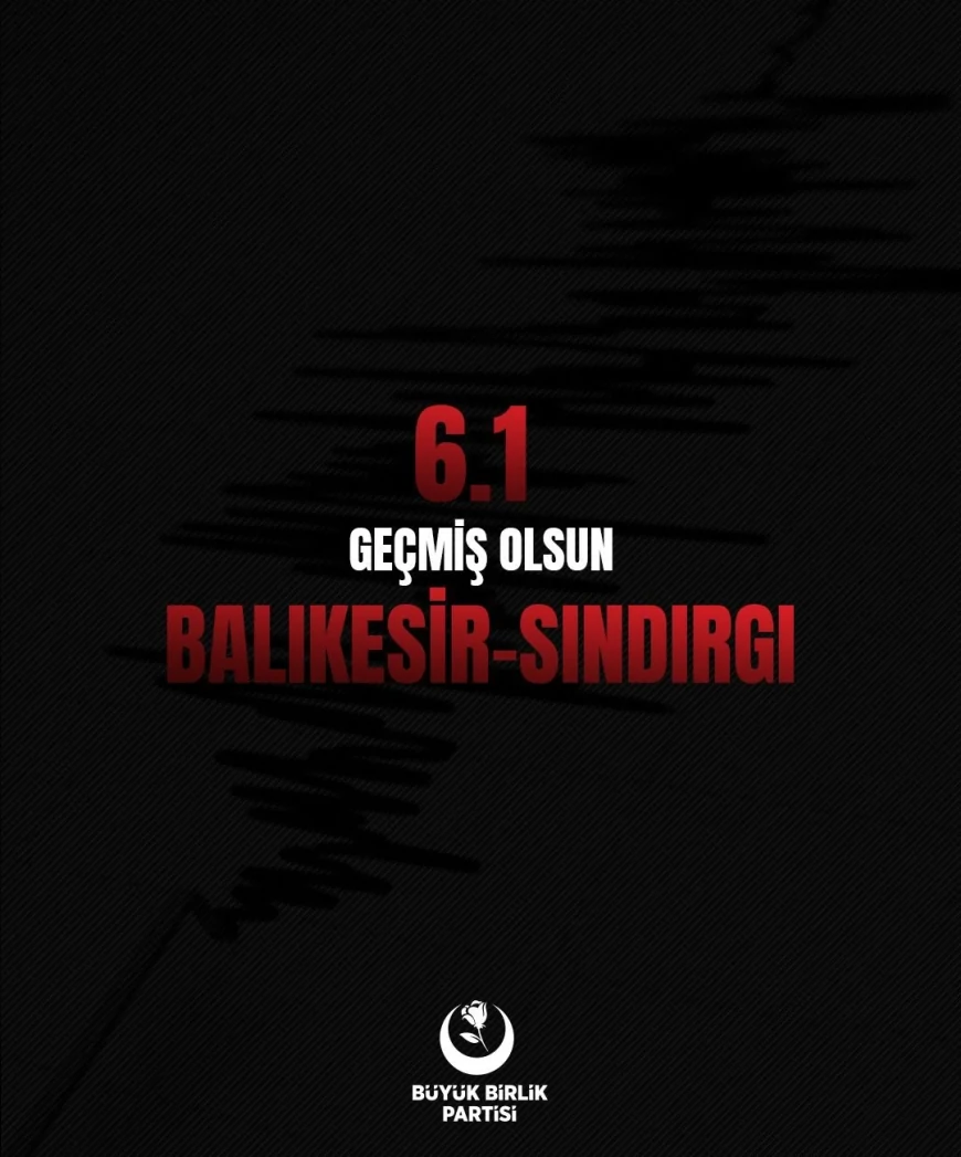 Balıkesir’in Sındırgı ilçesinde saat 22.48’de meydana gelen 6,1 büyüklüğündeki deprem sonrası, Büyük Birlik Partisi (BBP) MKYK Üyesi ve Güneydoğu Anadolu Bölge Sorumlusu Recep Er, bir mesaj yayımlayarak depremden etkilenen vatandaşlara geçmiş olsun dileklerini iletti. Er, “Dualarımız Balıkesir ve çevre illerimizle, Rabbim ülkemizi her türlü afetten korusun.” ifadelerini kullandı.