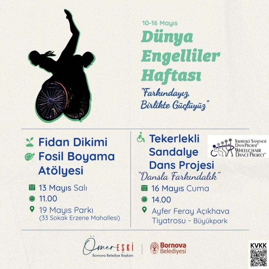 Bornova Belediyesi’nin Engelliler Haftası kapsamında planladığı diğer etkinlikler arasında 13 Mayıs Salı günü saat 11.00’de Erzene Mahallesi 19 Mayıs Parkı’nda fidan dikimi ve fosil boyama atölyesi yer alıyor. 16 Mayıs Cuma günü ise saat 14.00’te Büyükpark’taki Ayfer Feray Açıkhava Tiyatrosu’nda “Dansla Farkındalık” etkinliği gerçekleştirilecek.