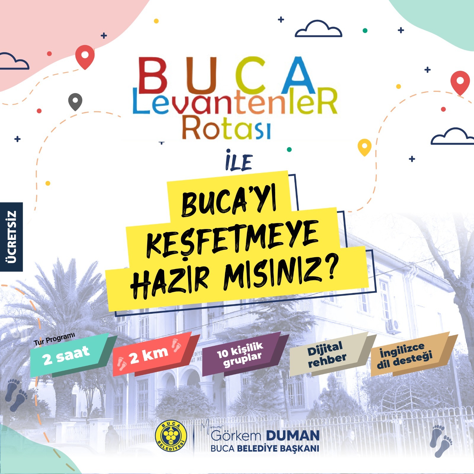 Tarihi rotayı keşfetmek isteyen vatandaşların, Buca Belediyesi’nin web sitesi olan https://www.buca.bel.tr adresinde karşılarına çıkan Buca Levanten Rotası ekranına tıklayarak, açılan sayfadaki başvuru linkine bilgilerini girmeleri yeterli olacak. İsteyenler, 439 10 10 (Dâhili 3135 – 3136) numaralı telefonu arayarak da başvuru yapabilecek.