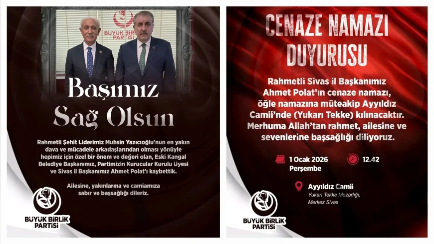 Büyük Birlik Partisi Kurucular Kurulu Üyesi, üç dönem Kangal Belediye Başkanlığı yapan ve Sivas Büyük Birlik Partisi İl Başkanlığı görevini yürüten Ahmet Polat, düzenlenen cenaze töreniyle Hakk’a uğurlandı. Törene, Büyük Birlik Partisi Genel Başkanı Mustafa Destici, parti yöneticileri, teşkilat mensupları, merhumun ailesi ve çok sayıda vatandaş katıldı.
