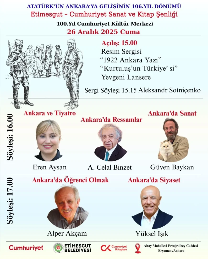 Cumhuriyet Kitap Kulübü’nün organizasyonuyla, Etimesgut Belediyesi ev sahipliğinde ve Cumhuriyet gazetesinin katkılarıyla düzenlenen “Etimesgut – Cumhuriyet Sanat ve Kitap Şenliği”, Atatürk’ün Ankara’ya gelişinin 106. yıl dönümü kapsamında başlıyor. Etkinlikler, 26 Aralık Cuma günü Etimesgut Belediyesi 100. Yıl Cumhuriyet Kültür Merkezi’nde gerçekleştirilecek.