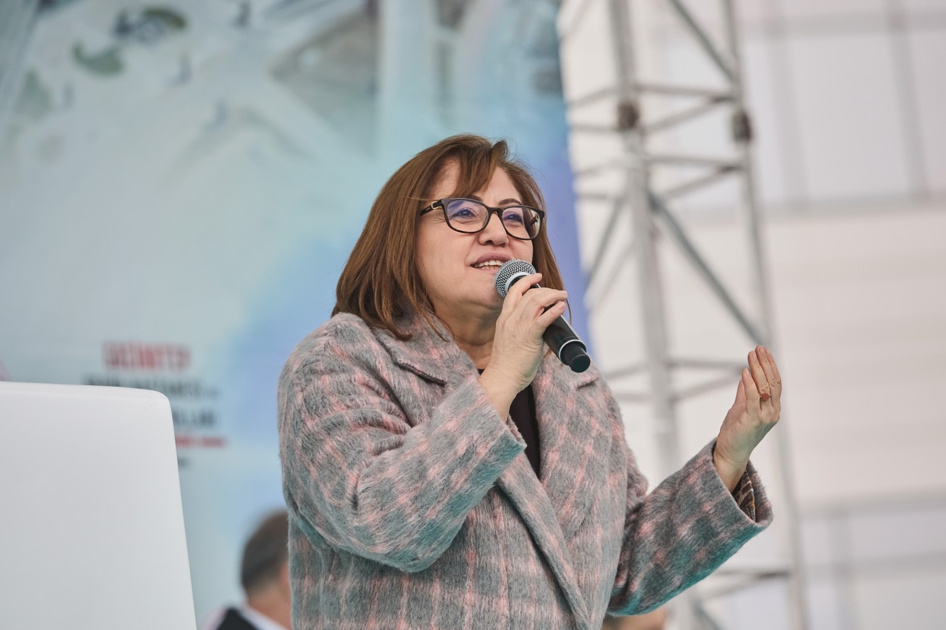 Cumhurbaşkanı Recep Tayyip Erdoğan’ın konuşması öncesi vatandaşlara seslenen Gaziantep Büyükşehir Belediye Başkanı Fatma Şahin ise alanı dolduran kalabalıklara teşekkür ederek, “Bu şanlı tarihin izi bizdedir. Garibin mazlumun gözü bizdedir. Yüzüncü yılında cumhuriyetin yıldızı parlıyor kutlu devletin. Bu devletin adı Türkiye olsun. Hedefi büyüktür büyük milletin. Maşallah Gaziantep. Sayın Cumhurbaşkanım Baş veren baş eğmeyen Gazi şehrimize hoş geldiniz sefalar getirdiniz. Şimdi bir söz vereceğiz. Gaziantep’e ikincilik yakışır mı? Üçüncülük yakışır mı? Gaziantep her zaman birinci olacak. Kararlı mıyız? Cumhurbaşkanımıza giderken Abdülhamit bakanımla milletvekilimle geldik Cumhurbaşkanım. Türkiye derecesi yaparak geldik demeye hazır mıyız? Gayret bizden zafer Allah’tan olacak” diye konuştu.