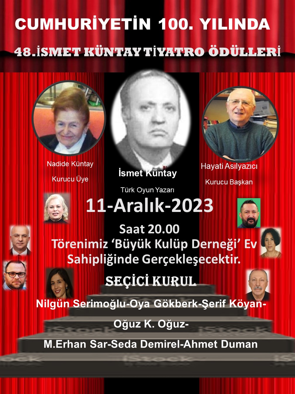 DurakMedya'dan Mustafa Barış Durak'ın haberine göre 48. İsmet Küntay Tiyatro Ödülleri Büyük Kulüp Derneği ev sahipliğinde gerçekleşecek. Gazeteci-Yazar Hayati Asılyazıcı’nın Seçici Kurul Başkanlığı'nı sürdürdüğü, Nilgün Serimoğlu, Oya Gökberk, Şerif Köyan, Oğuz K. Oğuz, Mehmet Sar, Ahmet Duman ve Seda Demirel’den oluşan “İsmet Küntay Tiyatro Ödülleri Seçici Kurulu” 2022-2023 Tiyatro Döneminde gerçekleştirilen performanslar arasında yapılan değerlendirmeler sonucu ödül alacak kurum ve kişileri belirledi.