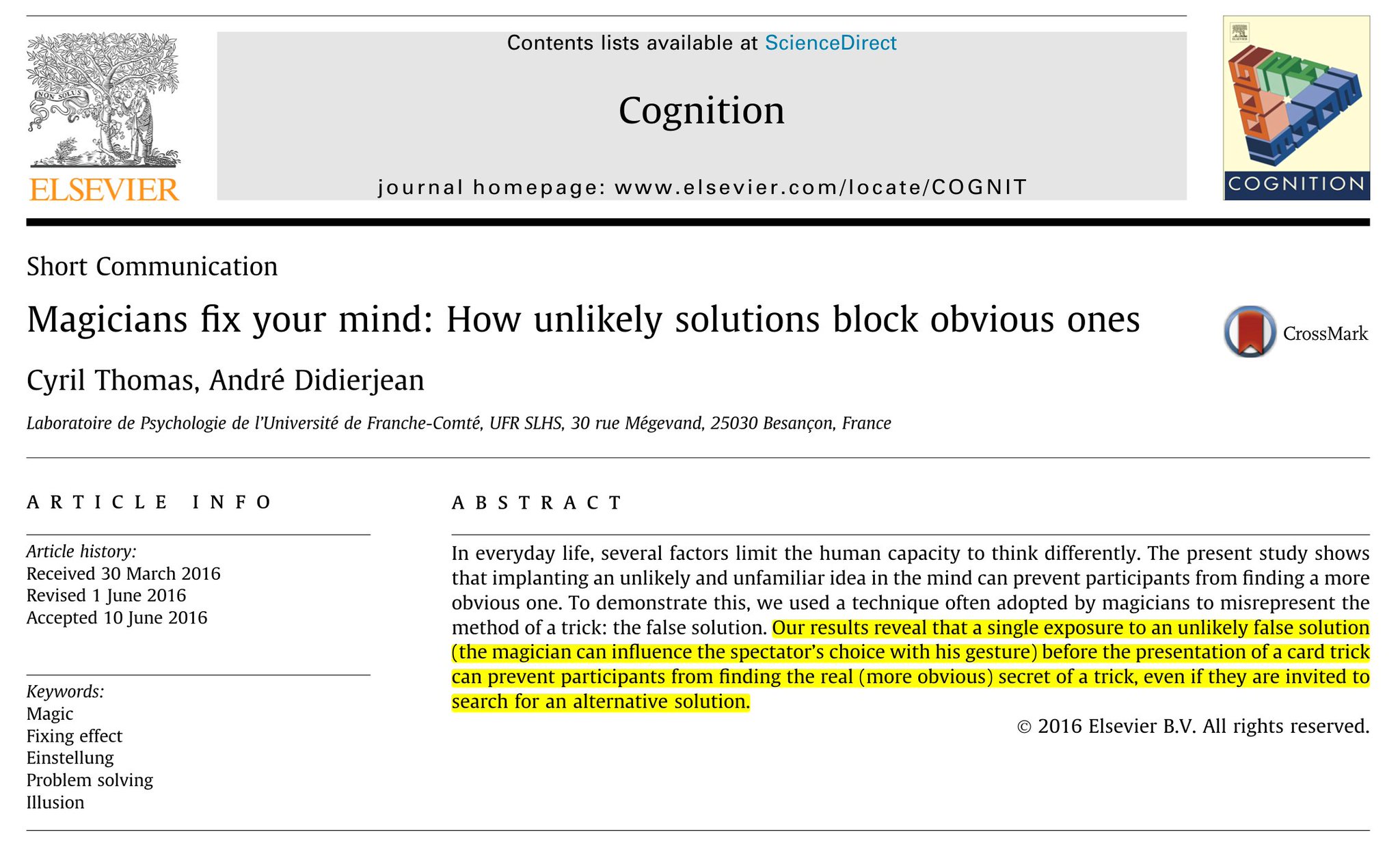 Bu durumda büyücüler tarafından evde kullanılmaktadır. Sihirbazlar, enjeksiyonun zihninde olası olmayan bir çözüm yaratarak, onları asıl numaradan uzaklaştırır ve bunun yerine uygulanmasında hileyi fark etmesi zorlaşır. Bu taktik, insan beyninin eğilimlerini kullanarak yanıltıcı bir ilizyon yaratmanın bir yoludur.