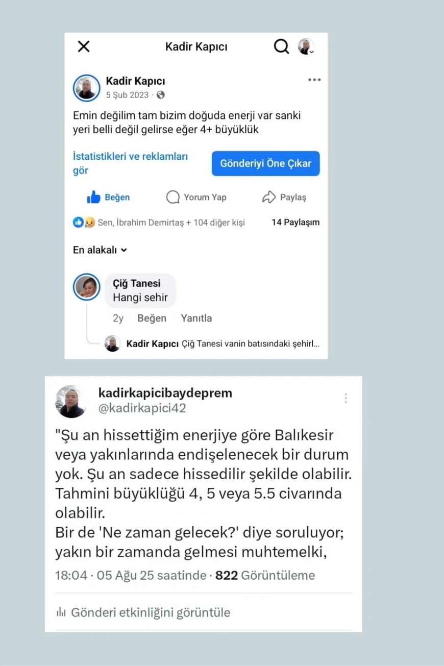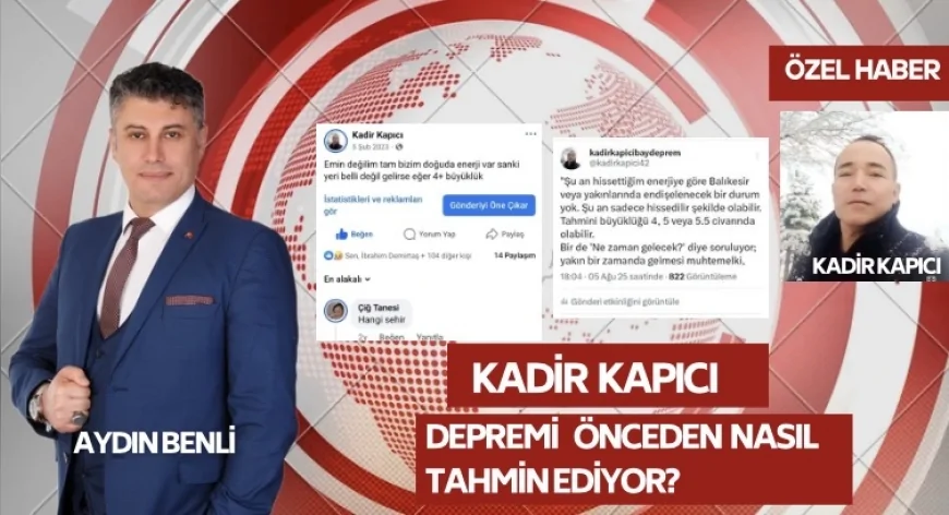 Kimi insanlar doğa olaylarını sadece bilimsel verilerle anlamaya çalışır, kimi ise bedenindeki işaretleri okuyarak… Kadir Kapıcı, tam da bu ikinci gruba giriyor. Onun için deprem bir sarsıntıdan çok daha fazlası. Vücudunda beliren ağrılar, duru görüyle birleşiyor ve adeta yaklaşan felaketleri günler, bazen de saatler öncesinden haber veriyor. Türkiye’nin son yıllarda yaşadığı büyük depremlerden tutun da kayıp cesetlerin bulunmasına kadar birçok olayda, adı sık sık duyuldu. Kadir Kapıcı On yıldır deprem tahmini yapıyor, b güne kadar iki bin tahmin yapmış 1990 tahmini nokta atışı bildiğini iddia ediyor ve facebook sayfasında ve youtubekanalından önceden paylaşmış ve açıklamış.