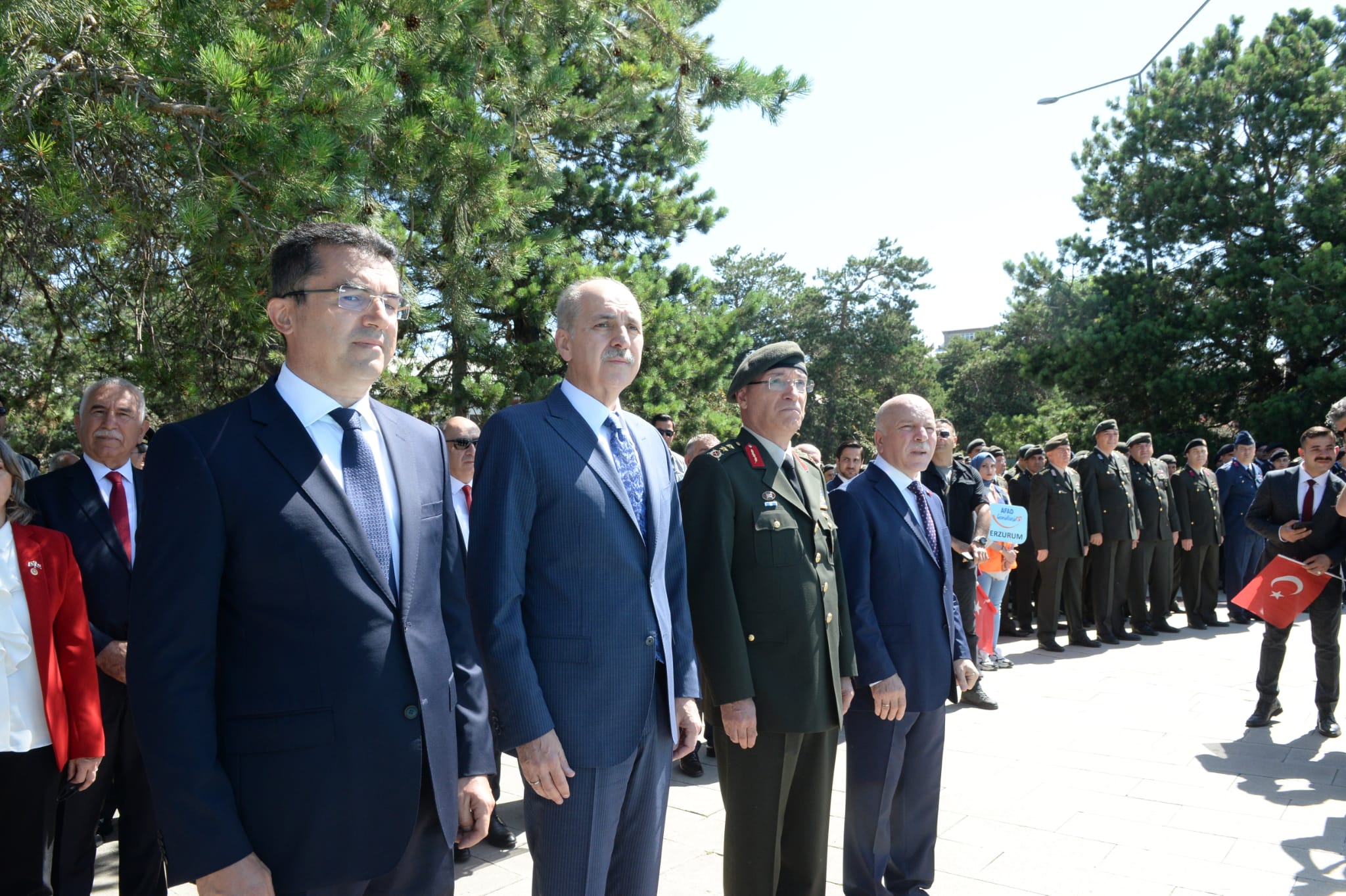 Başkan Kurtulmuş, Vali Okay Memiş, 9. Kolordu Komutanı Tümgeneral Tümgeneral Fedai Ünsal ve Büyükşehir Belediye Başkanı Sekmen’in Atatürk Anıtı'na çelenk sunduğu tören, saygı duruşu ve İstiklal Marşı'nın okunmasıyla sona erdi.