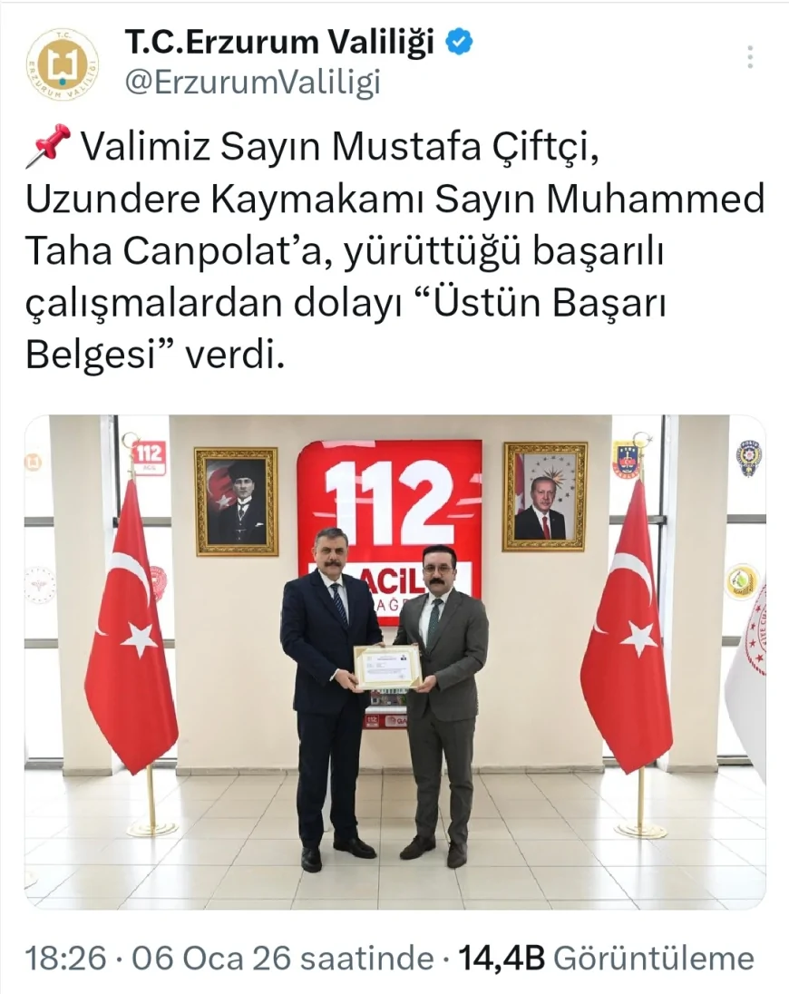 Erzurum Valisi Mustafa Çiftçi, Uzundere Kaymakamı Muhammed Taha Canpolat’ı ilçede yürüttüğü kamu hizmetleri, idari çalışmalar ve koordinasyon faaliyetlerindeki başarısı nedeniyle “Üstün Başarı Belgesi” ile ödüllendirdi. Törende, kamu yönetiminde etkinlik ve hizmet kalitesine vurgu yapıldı.