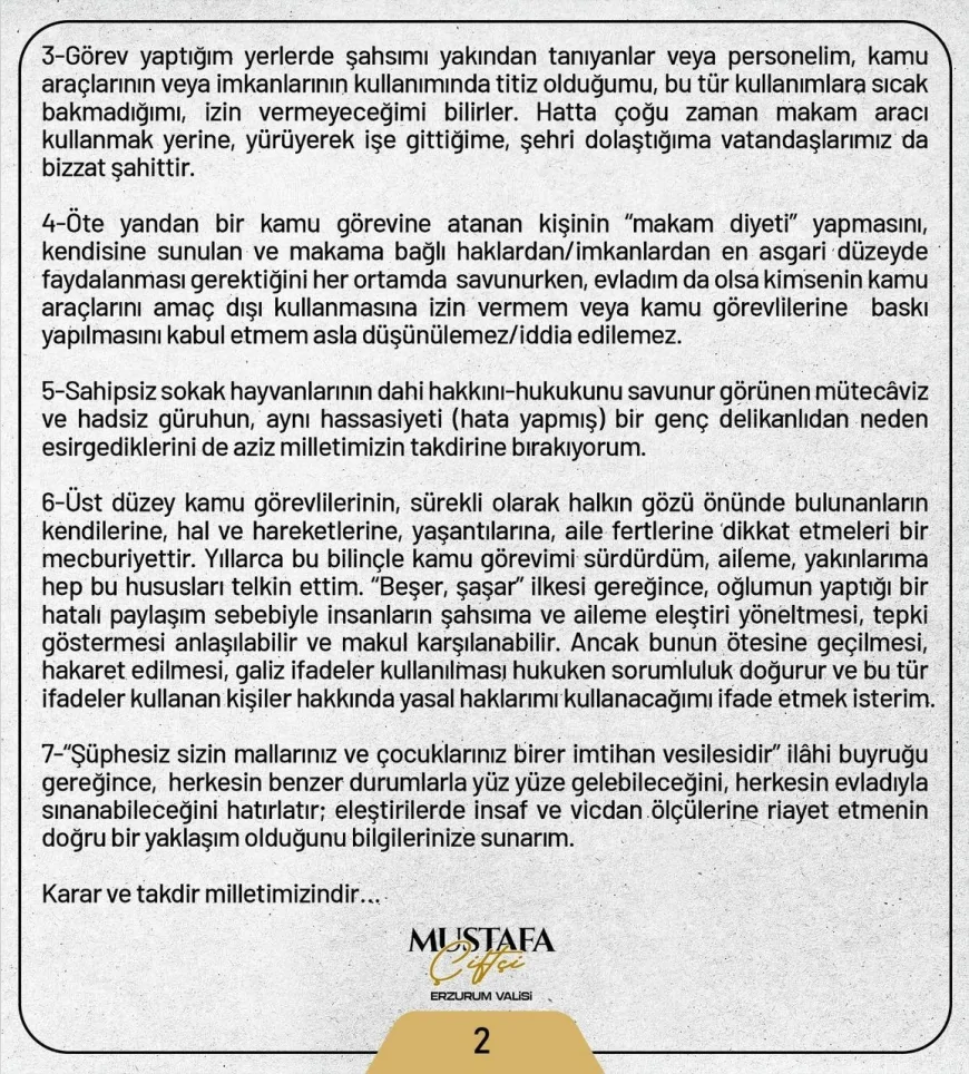 Erzurum Valisi Mustafa Çiftçi, oğlunun sosyal medyada yaptığı paylaşım üzerinden şahsına ve ailesine yönelik yürütülen eleştirilere yazılı bir açıklama ile yanıt verdi. 18 yaşındaki oğlu A.T.'nin valiliğe ait kapalı garajda çakarlı bir aracı çekerek kurgusal bir video paylaştığını belirten Çiftçi, paylaşımın gerçeği yansıtmadığını vurguladı.