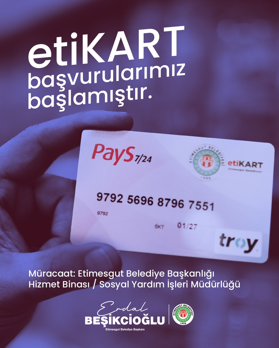 Sosyal destek kartı olarak kullanılan etiKART, dar gelirli ailelerin temel ihtiyaçlarını karşılamalarına yardımcı olmayı amaçlayan bir destek hizmeti olarak sunuluyor. Kart, yalnızca alışveriş amacıyla kullanılabiliyor. Başvuruda bulunmak isteyen vatandaşlar, gerekli belgelerle birlikte Etimesgut Belediyesi Sosyal Yardım İşleri Müdürlüğü’ne müracaat edebilecek.