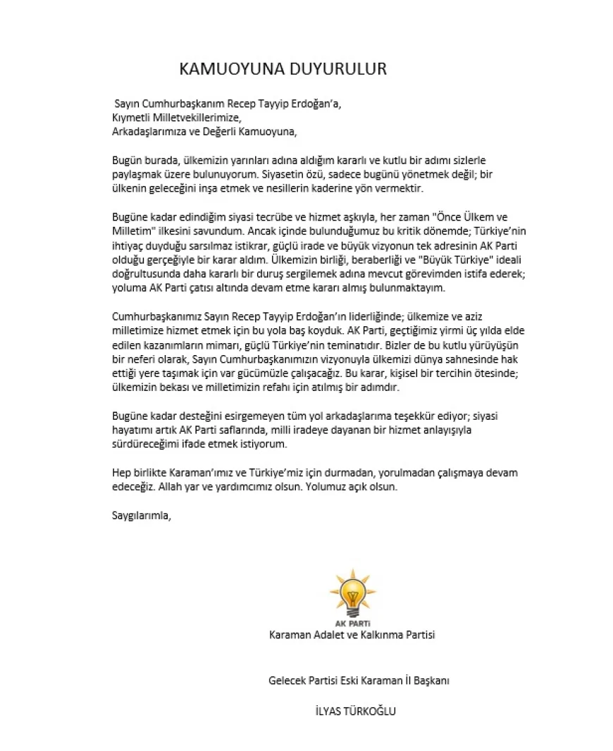 Gelecek Partisi Eski Karaman İl Başkanı İlyas Türkoğlu, kamuoyuna yaptığı açıklamada siyasi kariyerine AK Parti çatısı altında devam etme kararı aldığını açıkladı. Türkoğlu, kararını “ülkenin yarınları, istikrar ihtiyacı ve güçlü irade” vurgusuyla duyurdu.