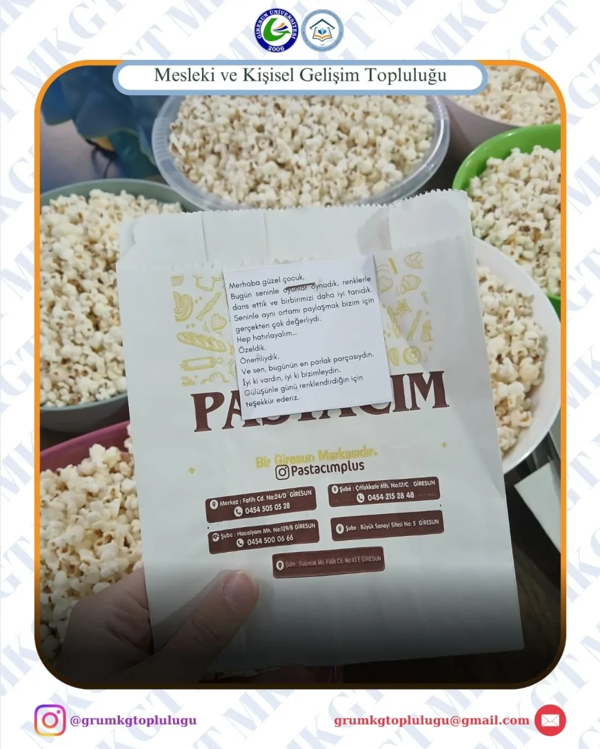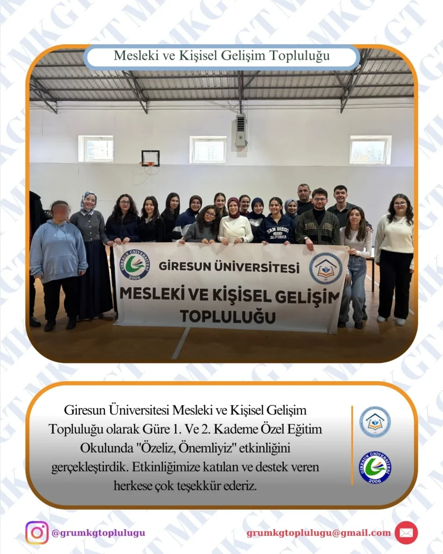 Giresun Üniversitesi bünyesinde faaliyetlerini sürdüren Mesleki ve Kişisel Gelişim Topluluğu, sosyal sorumluluk bilinciyle yürüttüğü çalışmalarına bir yenisini ekledi. Topluluk, Güre 1. ve 2. Kademe Özel Eğitim Okulu’nda düzenlenen “Özeliz, Önemliyiz” etkinliği kapsamında özel gereksinimli öğrencilerle bir araya geldi.