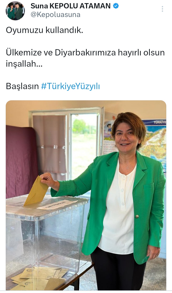 Ak Parti Diyarbakır Milletvekili Suna Kepolu Ataman : Oyumuzu kullandık. Ülkemize ve Diyarbakırımıza hayırlı olsun inşallah...