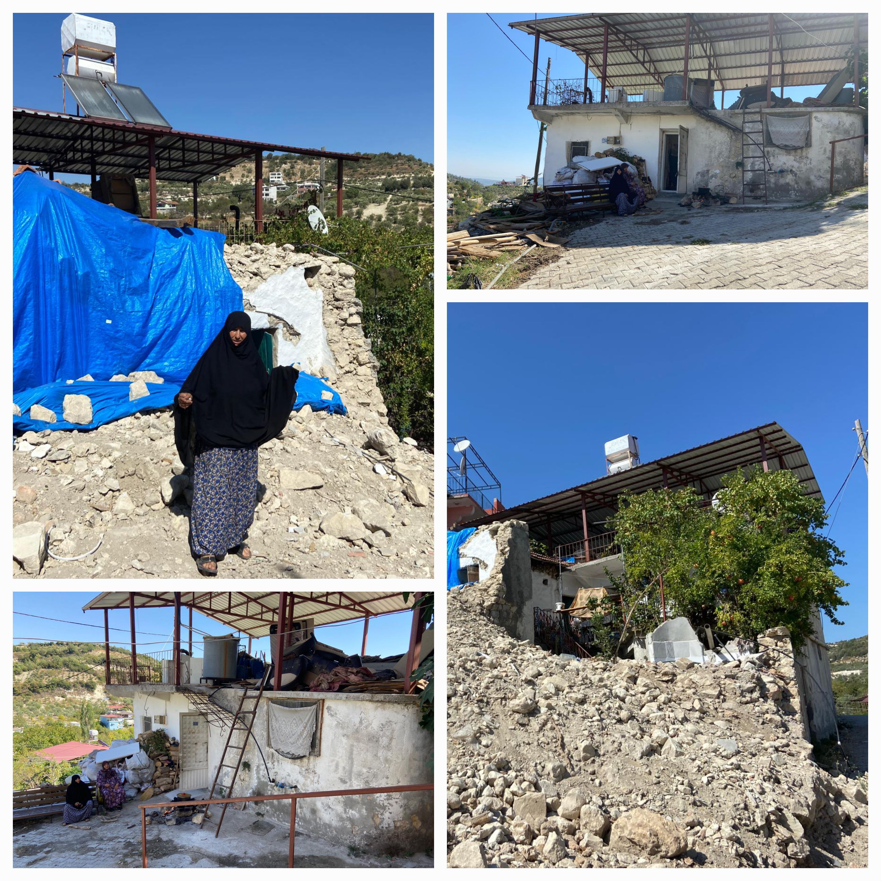 Makbule Deveci’i "Antakya’da 5 evinin yıkıldığını sadece buradaki köy evlerinin sağlam olduğunu tüm ev eşyalarının bu evde koruma altına aldıklarını eşyaların bir bölümünün olduğu odanın duvarlarını ve çatısı yıkım ekiplerince zarar gördüğünü ve buraları brandayla kapattıklarını söyleyen Deveci sözlerine şöyle devam etti;biz bu köy evinde kocalarını kaybetmiş yaşlı üç kız kardeş kalıyoruz zaten evimiz hasarlı olsa biz neden oturalım ki çadırda kalırız daha iyi, fakat evimiz sağlam zemini kaya neden yıkılmasını isteyeyim.