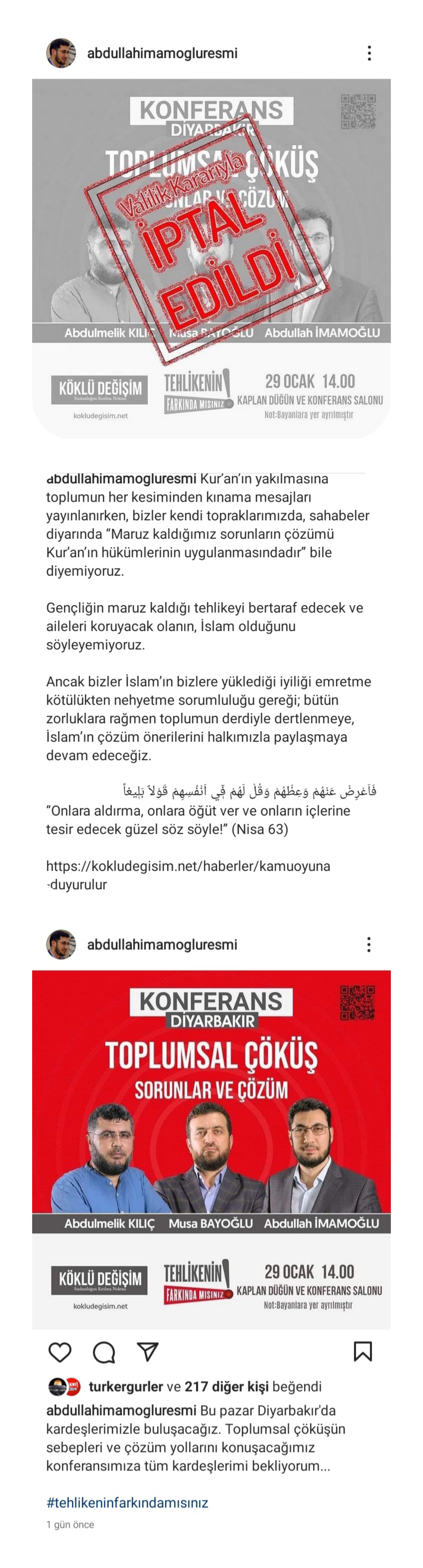 Oysa bizi takip eden herkes bilir ki Köklü Değişim’in düzenlemiş olduğu hiçbir etkinlikte güvenlik sorunu yaşanmamıştır. Yine herkes bilir ki düzenlemiş olduğumuz etkinliklerde bırakın insanı, hiçbir canlıya, kamu malına zarar verilmemiştir. Nitekim kampanya kapsamında düzenlediğimiz Ankara, İstanbul, Adana, Bursa ve Konya konferanslarında en ufak bir sorun dahi yaşanmamıştır. Hal böyle iken konferansımızın hiçbir somut gerekçe gösterilmeden sadece güvenlik tedbirleri gerekçesi ile iptal edilmiş olması gayet üzücü bir durumdur.
