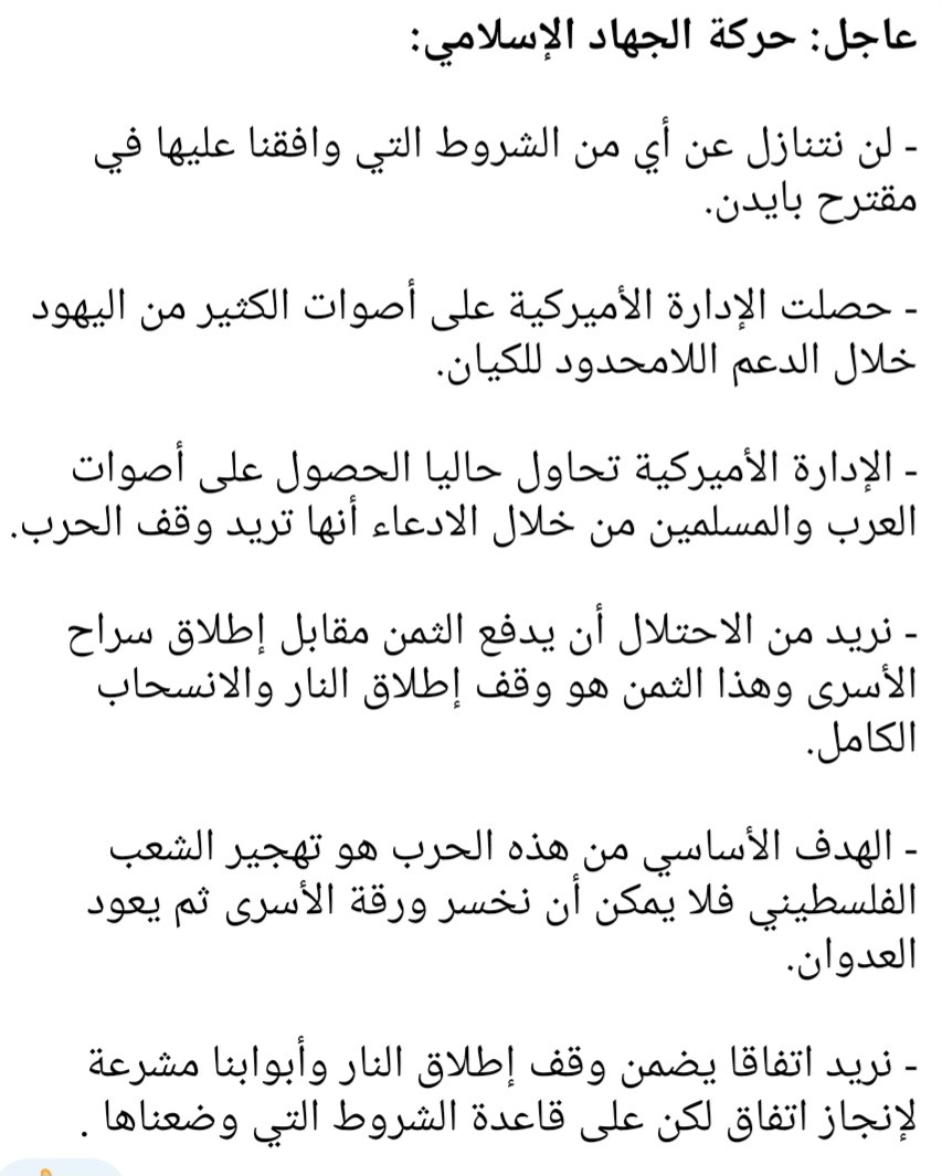 Esirlerin serbest bırakılmasının bedelini işgalcilerin ödemesini istiyoruz ve bu bedel ateşkes ve tamamen geri çekilmedir.