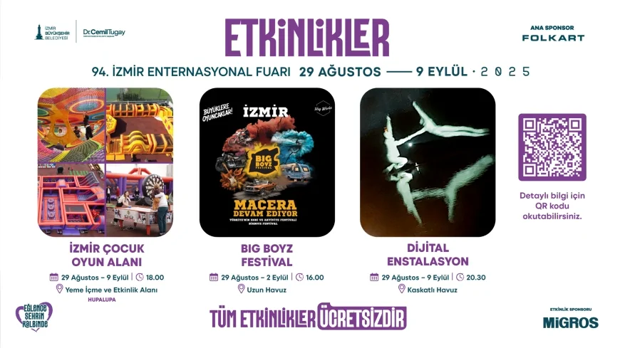 İzmir Büyükşehir Belediyesi’nin farklı birimlerinin katkılarıyla renkli etkinlikler de Gençlik ve Spor Alanı’nda ziyaretçilerle buluşacak. Meslek Fabrikası, seramik ve barista atölyeleri ile mobil istihdam otobüsünü alana taşıyacak. Kültür ve Sosyal İşler Dairesi baskı, mozaik ve vitray atölyeleri ile katılım sağlayacak. ESHOT ise “Geçmişten Günümüze ESHOT” sergisi ve nostaljik mavi otobüs sergisi ile ziyaretçilere ulaşacak. Eşrefpaşa Hastanesi, kuracağı sahra çadırı ile alanda yer alacak. Engelli Çalışmaları Birimi, sokak farkındalığı etkinlikleri, Boccia sporu, kutu oyunları, destekli istihdam programı ve tekerlekli sandalye bakımı uygulamaları ile farkındalık yaratacak. Gençlik Çalışmaları Birimi ise çanta boyama, origami ve karaokenin yanı sıra yapay zeka oyun ve avatar atölyeleri, Genç İzmir Pop Orkestrası akustik performansı, iyilik duvarı, kil deneyim atölyesi, festival makyajı, balon patlatma yarışması, Erasmus+ deneyim aktarım oyunu, hafıza yarışması, GO ve XOX oyunları, tütsü ve resim deneyim atölyeleri, Japon kültürünü tanıtan yukata deneyimi ve extreme dart etkinlikleri ile fuar katılımcılarına oldukça geniş bir yelpazede deneyim yaşatacak. Kadın Çalışmaları Birimi de taş grafitisi atölyesi, dünya kahvesi atölyesi, şiddetsizlik atölyesi, kadınların İzmir haritası atölyesi, güçlenme durağı atölyeleri, bez çanta boyama atölyesi, eşitlik tüneli ve empati atölyesi ile farkındalık yaratacak. Spor Dairesi Başkanlığı da modern dans atölyesinin yanı sıra fuar boyunca yoga, tango, e-spor turnuvaları, çocuk jimnastik gösterileri ve ayak tenisi organizasyonlarıyla alana hareket katacak.