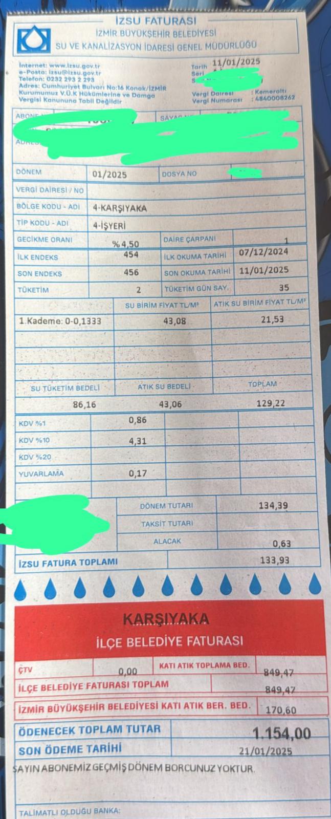 170, Karşıyaka belediyesi 850 lira katı atık bedeli ekledi ve fatura