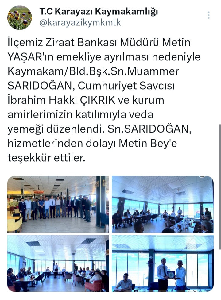 "İlçemiz Ziraat Bankası Müdürü Metin YAŞAR'ın emekliye ayrılması nedeniyle Kaymakam/Bld.Bşk. Sn.Muammer SARIDOĞAN, Cumhuriyet Savcısı İbrahim Hakkı ÇIKRIK ve kurum amirlerimizin katılımıyla veda yemeği düzenlendi. Sn.SARIDOĞAN, hizmetlerinden dolayı Metin Bey'e teşekkür etti"