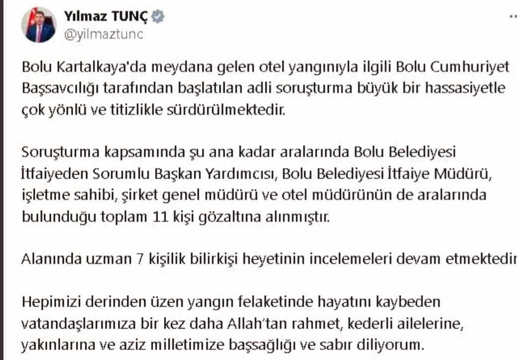 Adalet Bakanı Yılmaz Tunç, olayla ilgili yaptığı açıklamada, soruşturmanın titizlikle yürütüldüğünü belirtti. Tunç, “Şu ana kadar, Bolu Belediyesi İtfaiyeden Sorumlu Başkan Yardımcısı, İtfaiye Müdürü, işletme sahibi, şirket genel müdürü ve otel müdürünün de aralarında bulunduğu toplam 11 kişi gözaltına alındı. Uzman bilirkişi heyeti incelemelerine devam ediyor” dedi. Tunç, hayatını kaybeden vatandaşlar için başsağlığı dileklerini de iletti.