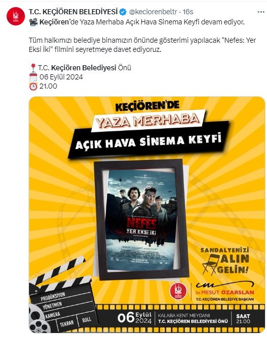 Keçiören Belediyesi'nin düzenlediği Yaza Merhaba Açık Hava Sinema Keyfi etkinliğinde 6 Eylül 2024 Cuma günü gösterilecek film açıklandı. Keçiörenliler bu özel gösterime davet edildi.