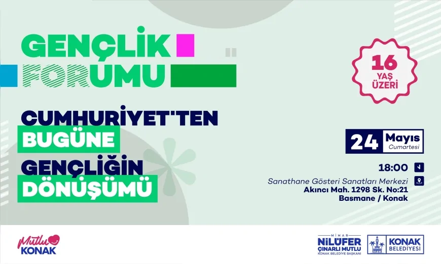 Konak Belediyesi’nin ev sahipliğinde 24 Mayıs Cumartesi günü düzenlenecek olan “Cumhuriyet’ten Bugüne Gençliğin Dönüşümü” başlıklı Gençlik Forumu, 16 yaş ve üzeri gençleri Sanathane Gösteri Sanatları Merkezi’nde bir araya getirecek. Konak Belediye Başkanı Nilüfer Çınarlı Mutlu, tüm gençleri forumda düşüncelerini özgürce ifade etmeye davet etti.