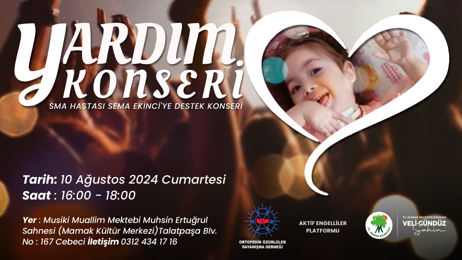 Mamak Belediyesi SMA tip-1 hastası olan Sema Ekinci için konser düzenliyor. Musiki Muallim Mektebi’nde düzenlenecek konserde 10 bin TL ve üzeri bağış yapan vatandaşlara Mamak Belediye Başkanı Veli Gündüz Şahin sahnede plaket verecek.