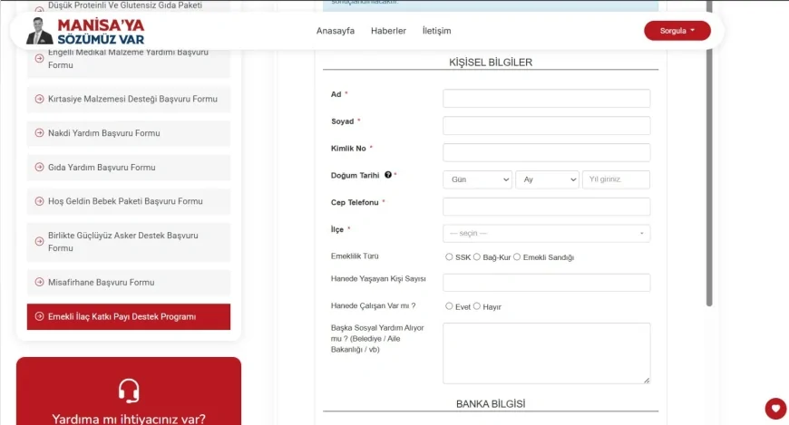 Program kapsamında başvuru yapacak emeklilerden bazı zorunlu bilgiler talep edilecek. Kişisel bilgiler bölümünde T.C. kimlik numarası, ad-soyad, doğum tarihi, cep telefonu ve Manisa’daki ikamet adresi istenecek.