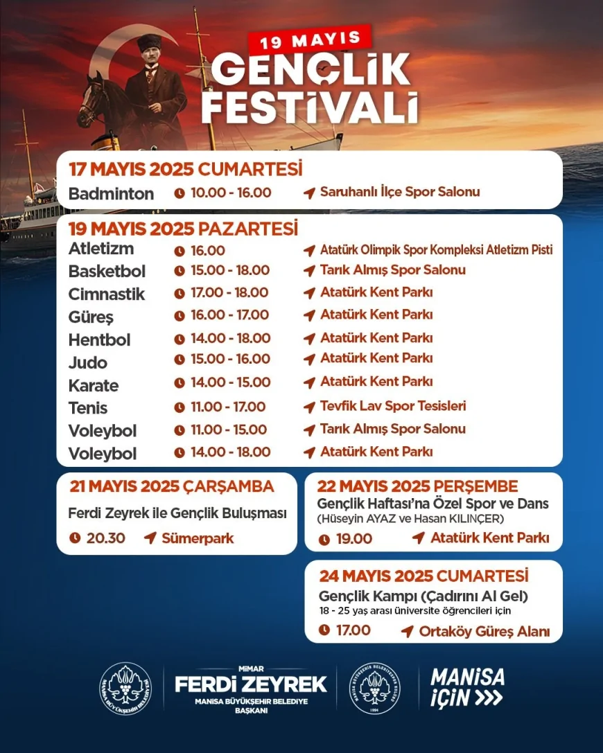 Manisa Büyükşehir Belediyesi, 19 Mayıs Atatürk’ü Anma, Gençlik ve Spor Bayramı’nı, 24 Mayıs’a kadar sürecek Gençlik Festivali ile kutluyor. Festival, gençlerin sosyal ve sportif faaliyetlere katılımını artırmak amacıyla birçok etkinliğe ev sahipliği yapacak. Program kapsamında çeşitli spor branşlarında turnuvalar düzenlenecek, dans ve müzik gösterileri sahnelenecek, gençler için özel kamp organizasyonları gerçekleştirilecek.