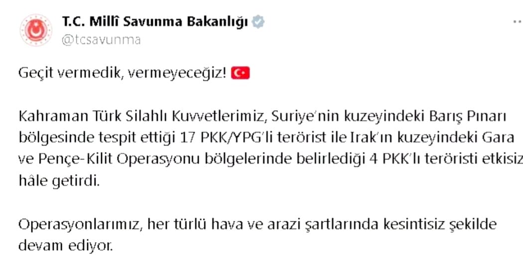 Milli Savunma Bakanlığı, yaptığı açıklamada, "Her bir terörist nerede olursa olsun tespit edilip etkisiz hâle getirilecektir. Terörle mücadelemiz azim ve kararlılıkla devam edecektir" ifadelerine yer verdi.Türk Silahlı Kuvvetleri’nin bölgedeki