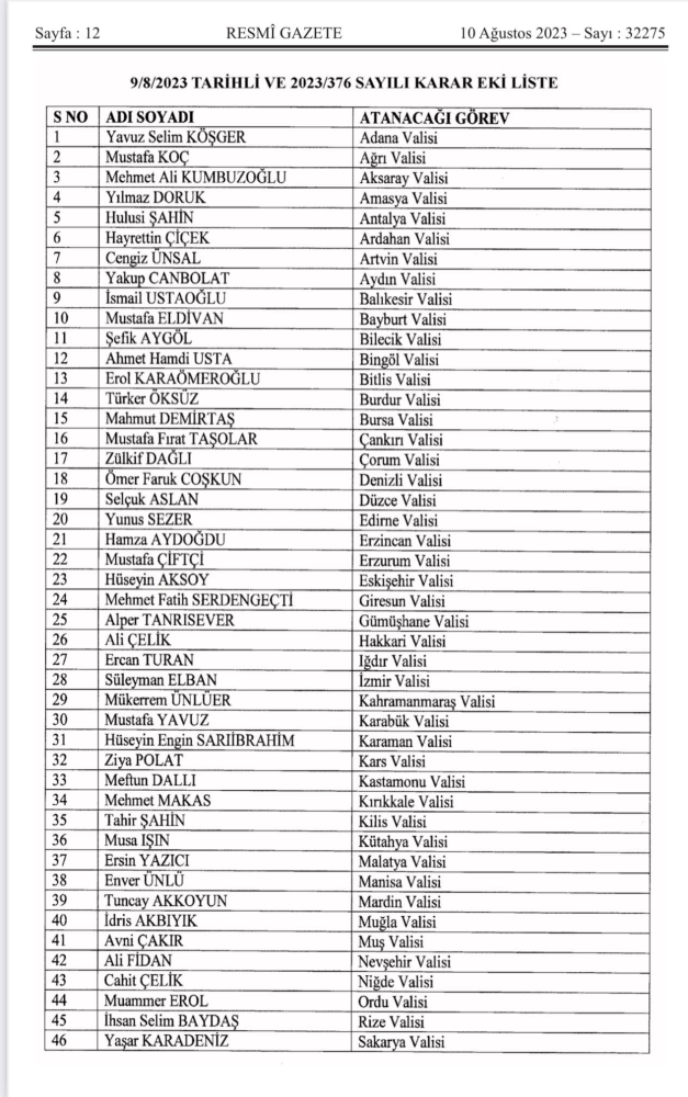 Valiler Kararnamesi Resmi Gazete’de yayımlandı. Cumhurbaşkanı Recep Tayyip Erdoğan imzasıyla 57 ile yeni vali ataması yapıldı.
