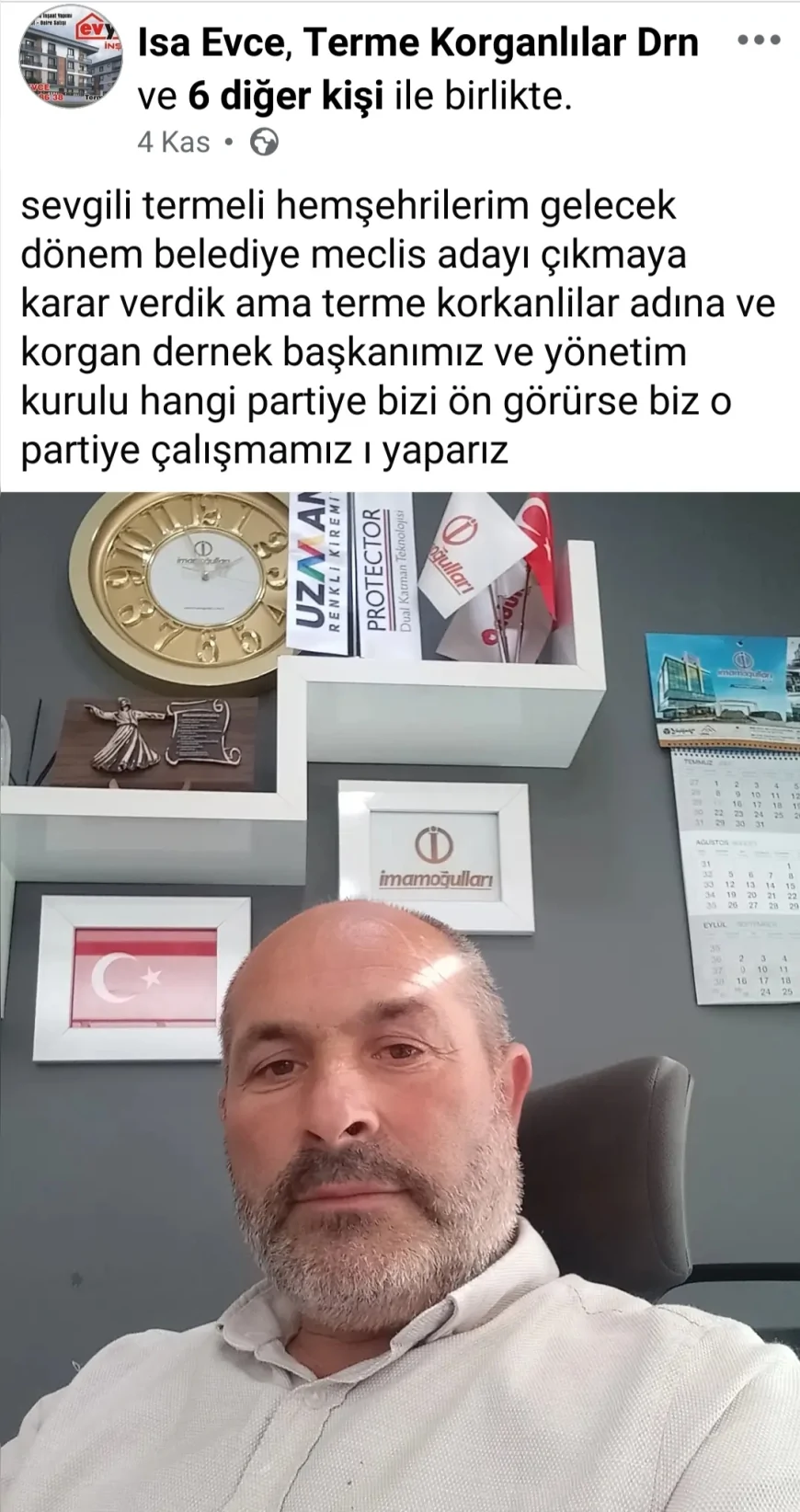 Terme Korganlılar Derneği üyesi olan ve bilgisayar sektöründe faaliyet gösteren İsa Evce, belediye meclis üyesi adaylığını açıklarken hangi siyasi partiden aday olacağının derneğin ilerleyen süreçte yapacağı istişare toplantısıyla belirleneceğini söyledi. Korganlı bir aileden gelip Terme’de büyüdüğünü vurgulayan Evce, kente daha iyi hizmet verebilmek için çalışmalarını yoğun şekilde sürdürdüklerini kaydetti.
