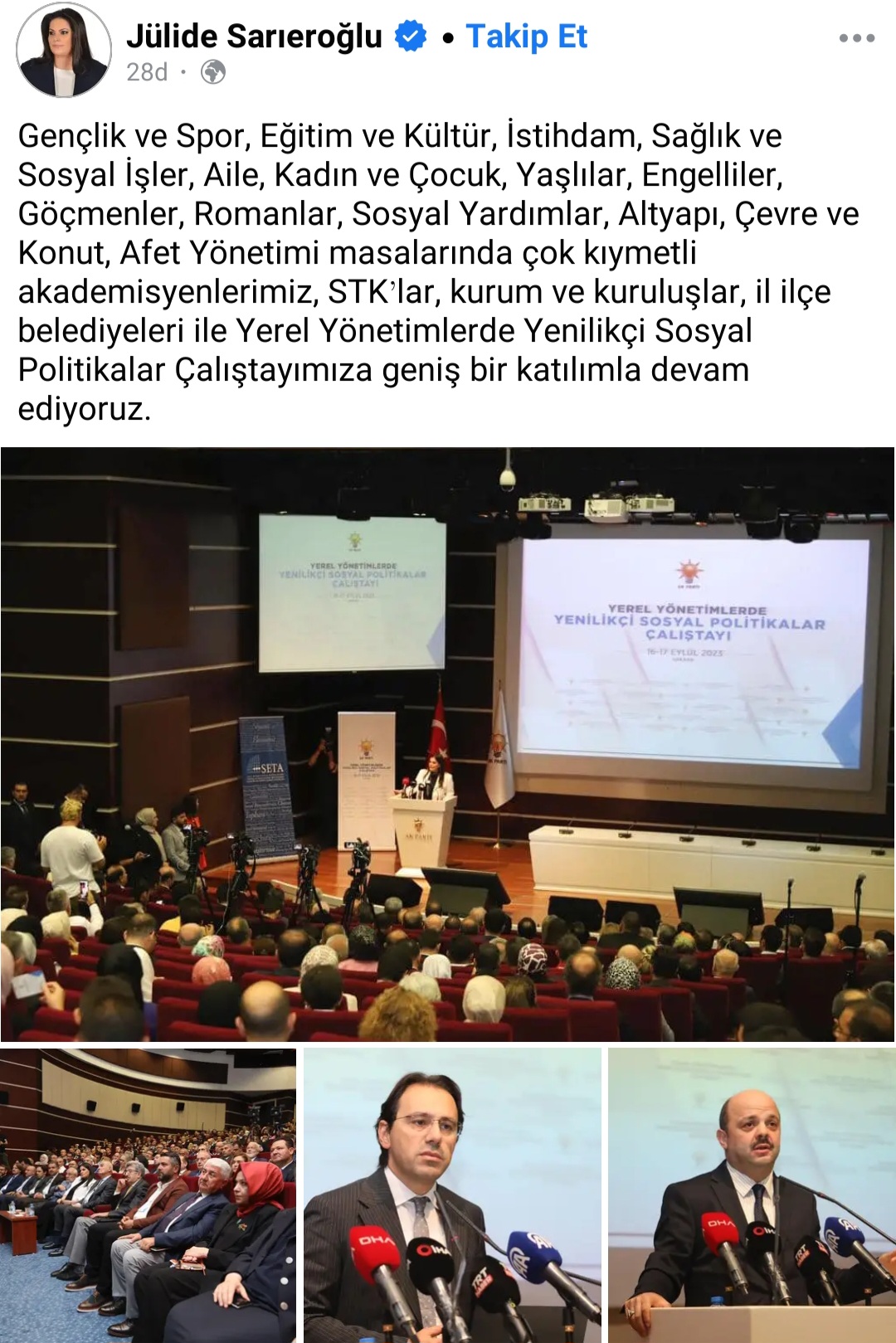 AK Parti Genel Başkan Yardımcı Jülide Sarıeroğlu "AK Parti açısından, mahalli idarelerdeki başarı çok önemlidir. Hikayemizin başlangıcı budur. Bugünlere kadar bizi getiren serüvenin ilk adımı, yerel seçimlerde elde ettiğimiz başarılardır" dedi. AK Parti Genel Merkezi’nde ; AK Parti Sosyal Politikalar ile Ar-Ge ve Eğitim Başkanlıkları ve Siyaset, Ekonomi ve Toplum Araştırmaları Vakfı'nca (SETA) düzenlenen Yerel Yönetimlerde Yenilikçi Sosyal Politikalar Çalıştayı planlandığı gibi başladı.