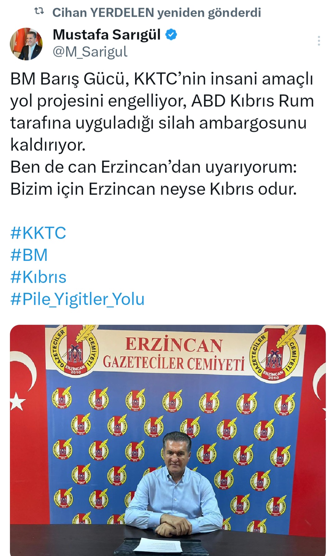 Sarıgül Erzincan'dan Kıbrıs'a Destek Mesajı Verdi