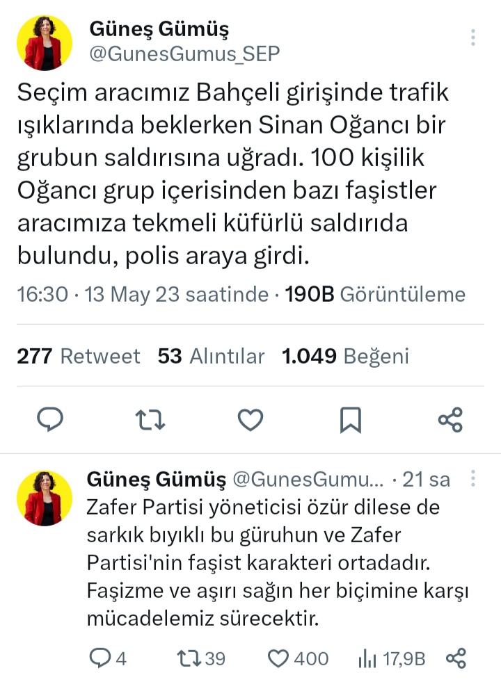 Kısaca ismi SEP olan Sosyalist Emekçi Partisi Genel Başkanı ve Ankara 1. Bölge Bağımsız Milletvekili Adayı Güneş Gümüş resmi sosyal medya hesabından olaya ilişkin mesajlar paylaştı: "Seçim aracımız Bahçeli girişinde trafik ışıklarında beklerken Sinan Oğancı bir grubun saldırısına uğradı. 100 kişilik Oğancı grup içerisinden bazı faşistler aracımıza tekmeli küfürlü saldırıda bulundu, polis araya girdi. Zafer Partisi yöneticisi özür dilese de sarkık bıyıklı bu güruhun ve Zafer Partisi'nin faşist karakteri ortadadır. Faşizme ve aşırı sağın her biçimine karşı mücadelemiz sürecektir"